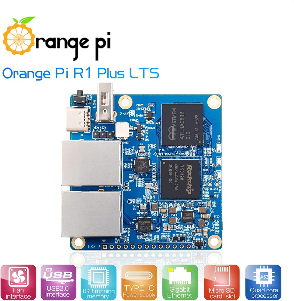 • Orange Pi R1 Plus LTS Microcontroller has a stylish appearance and good heat dissipation effect. It can be used in IoT gateways, NAS customization, download machines, industrial control equipment, telephones, small robots, VR, smart homes, routers and VOIP devices.