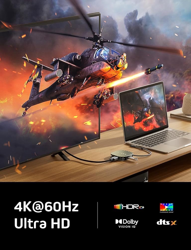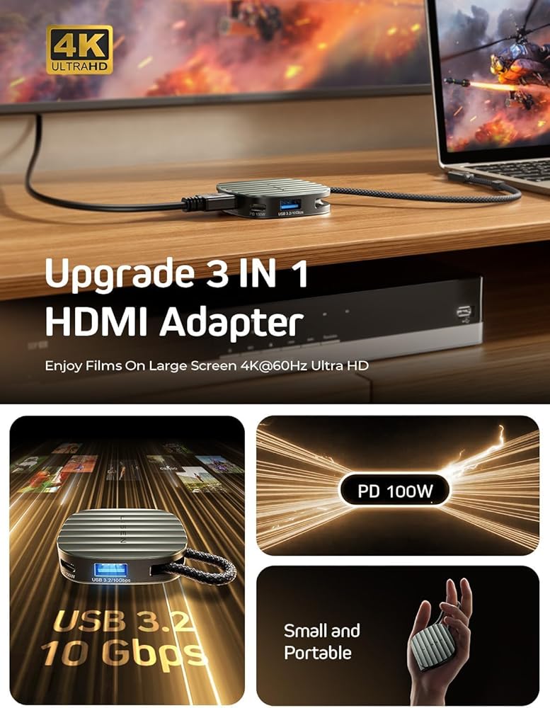Lisen 3 in 1 HDMI Adapter ، HDMI 4K@60Hz ، USB 3.2 10GBPS ، PD100W Charge