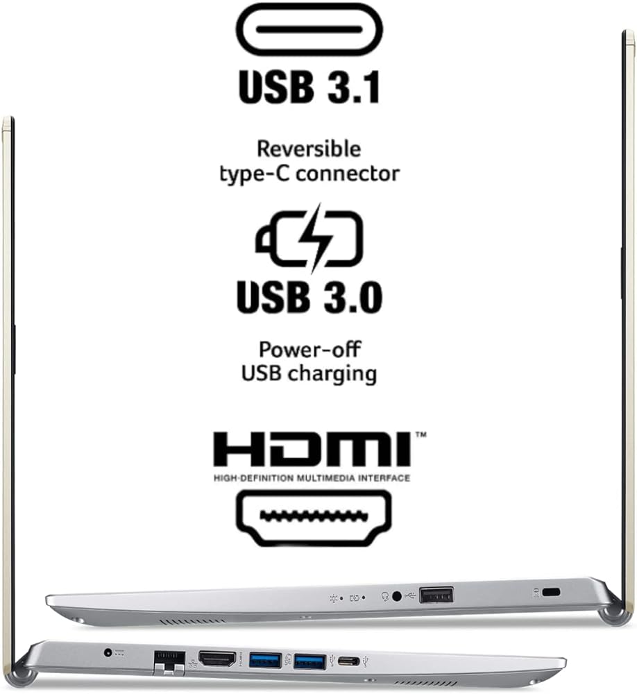 Acer Aspire 5 with 14.0" Full HD IPS Display, 11th Gen Intel Core i5-1135G7, 8GB DDR4, 512GB M.2 NVMe PCIe SSD, Wi-Fi 6 AX201 802.11ax, Windows 11 Home, Safari Gold thin & light laptop. The slim 17.95mm and aluminum top cover give the Aspire 5 a premium feel and appearance. Experience crisp, lifelike colors and sharp details on the FHD IPS display. The latest 11th Gen Core i5 processor from Intel delivers unmatched speed and intelligence. The new Intel Iris Xe Graphics provides performance and crisp, stunning visuals.