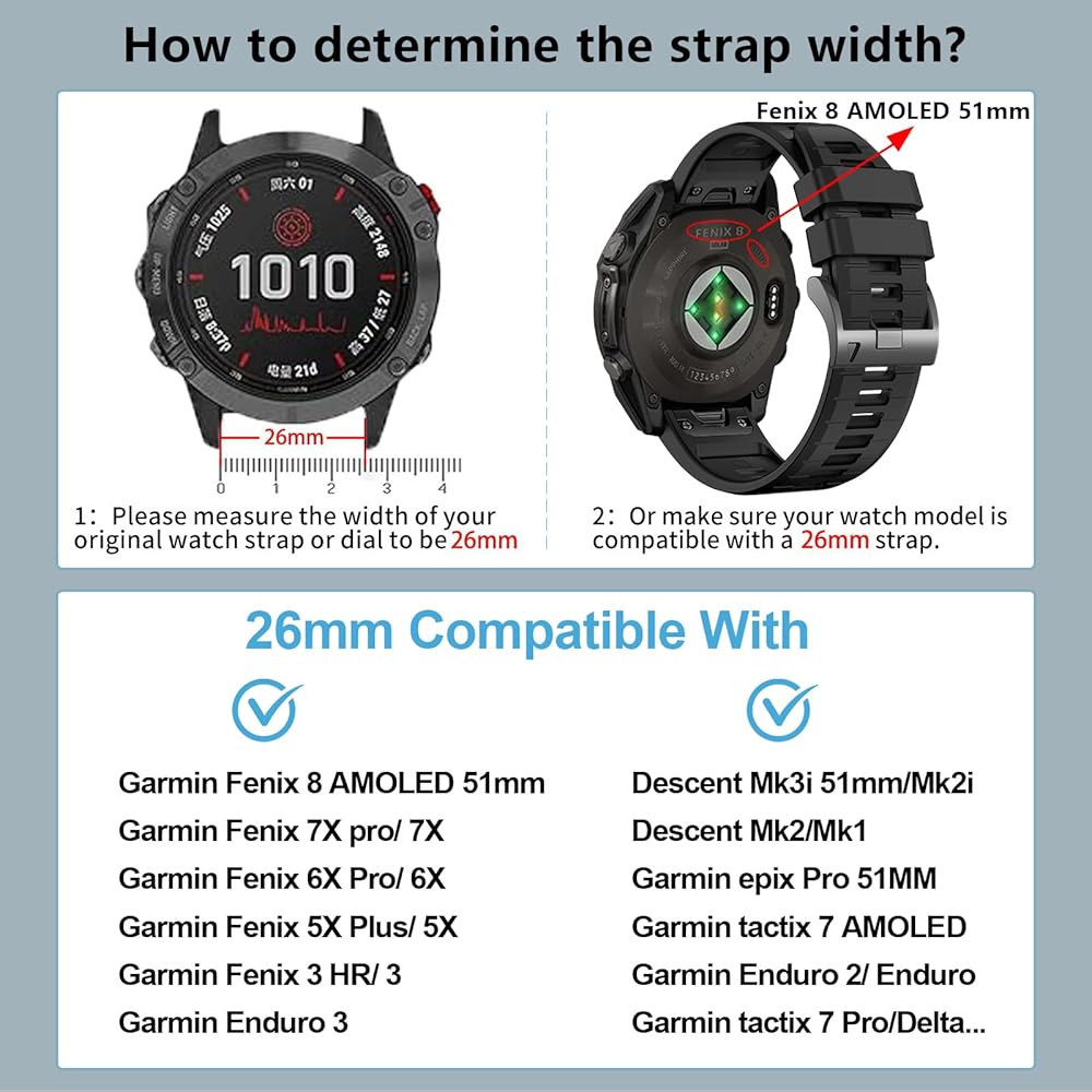 Compatible Models : This 26mm quick fit sport silicone straps compatible with Garmin Fenix8 AMOLED 51mm,Descent Mk3i 51mm,Epix Pro 51mm,Tactix 7 Amoled,Enduro 3,Enduro 2,Tactix 7 Pro,Fenix 7X,Fenix 7X Pro,Enduro, Fenix 6X Pro,Fenix 6X,Fenix 5X,Fenix 5X Plus,Fenix 3 ,Fenix 3 HR,Descent Mk1,Descent Mk2,Descent Mk2i,D2 Delta PX,Tactix Delta