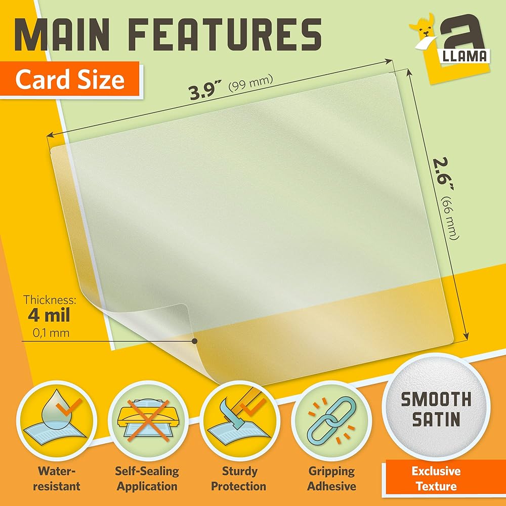 🦙 Choose PREMIUM TACTILE SELF LAMINATING SHEETS for business cards and ID cards; Sized 2.6 x 3.9 inches, 4 mils thick laminating pouches are perfectly suited for 2 x 3.5 inch papers, social security card protectors, ID card laminating pouches, and card stock; Self adhesive lamination sheets are UV light and moisture resistant for sticker labels, mailing labels, food labels, photos, flashcards, and cards