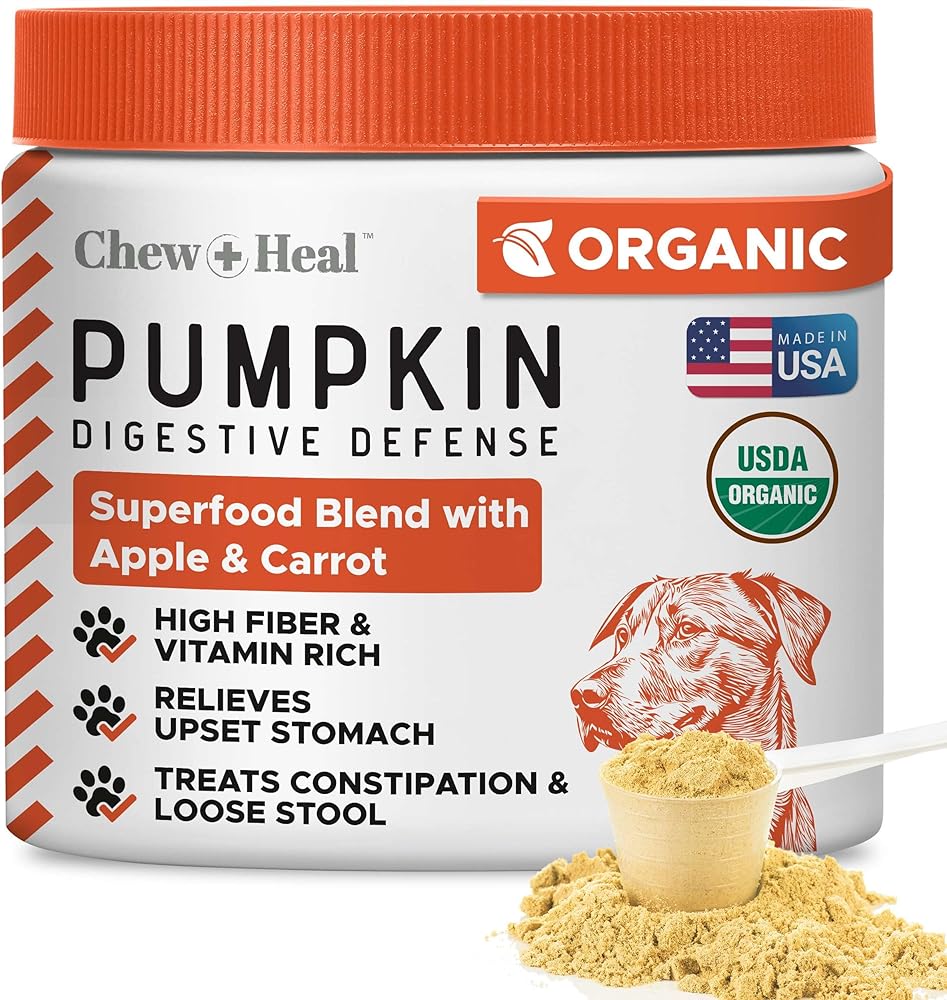 - Powder Chew + Heal's Organic Pumpkin عبارة عن مزيج من المكونات الطبيعية لصحة الجهاز الهضمي.