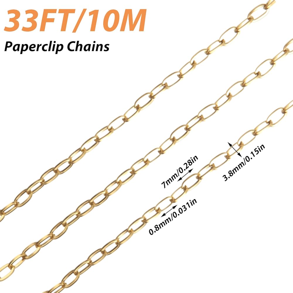 • PACKAGE INCLUDE: This 304 stainless steel chain for jewelry making is 32.8 feet long in total, the paperclip chain link is about 7mm long, 3mm wide and 0.8mm thick. Suitable for most pendants, such as crystal pendants and many other pendants; Chains are very suitable for dog tags, jewelry, necklaces, and many other purposes