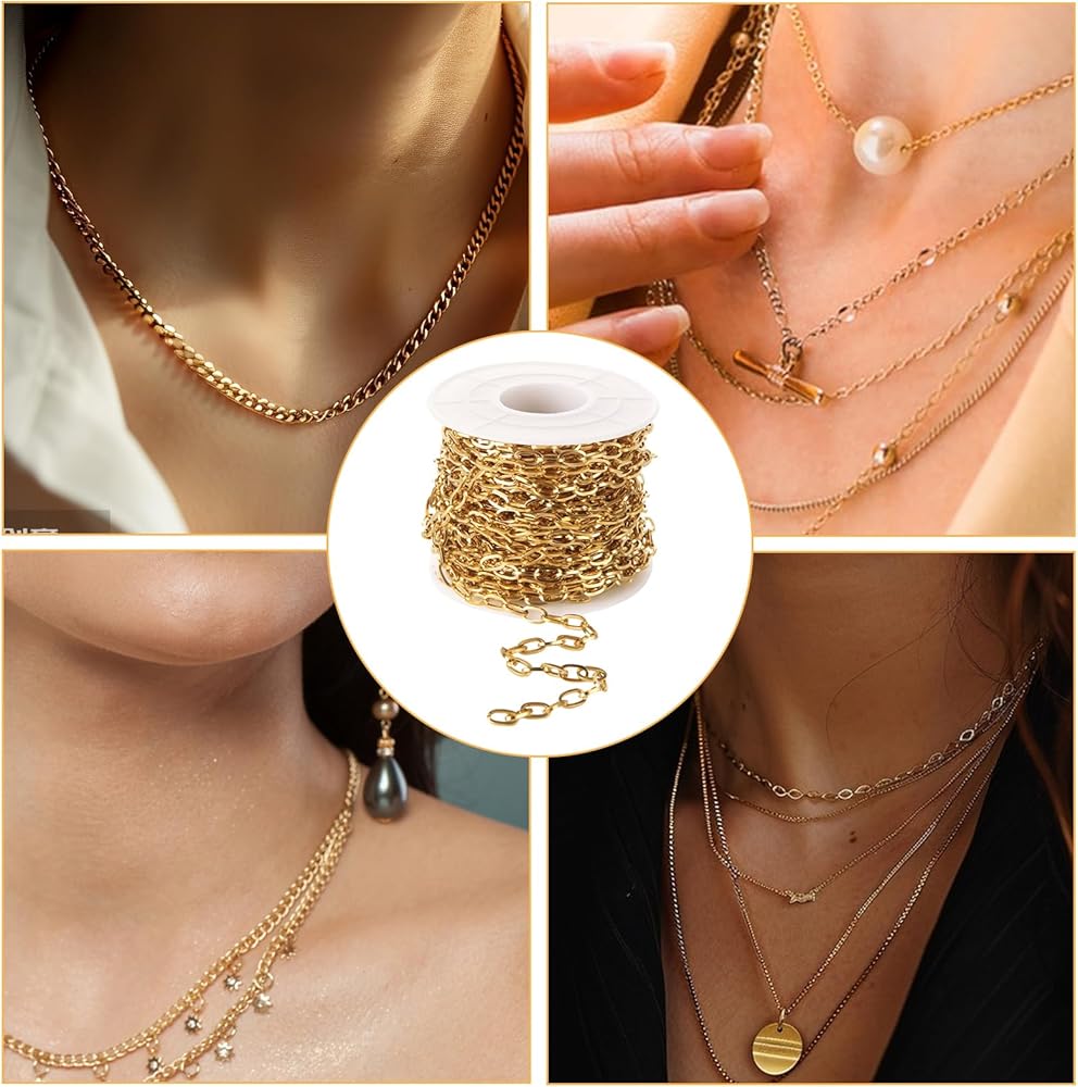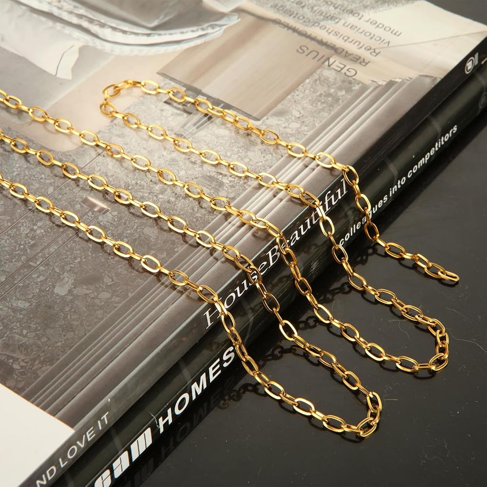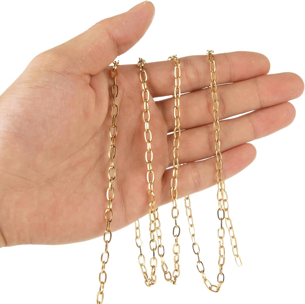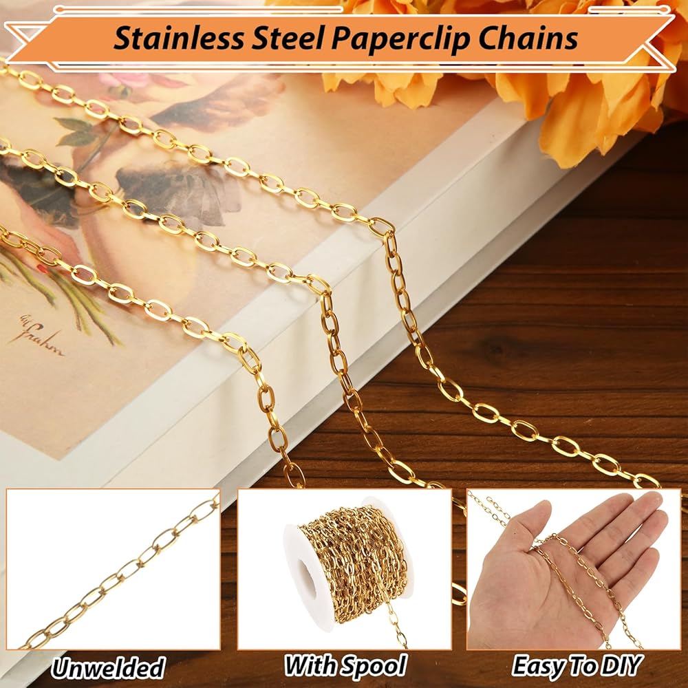 • HIGH QUALITY: Our 18K gold paperclip chain bulk is made of 304 stainless steel, high quality material with a bright looking, resistance to rust, oxidation and discoloration, sturdy, not easy to break. Hypo-allergenic makes the chains spool safe for sensitive skin