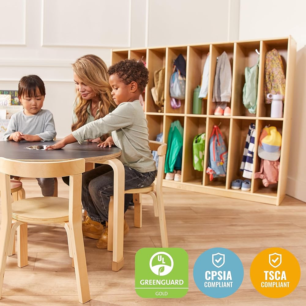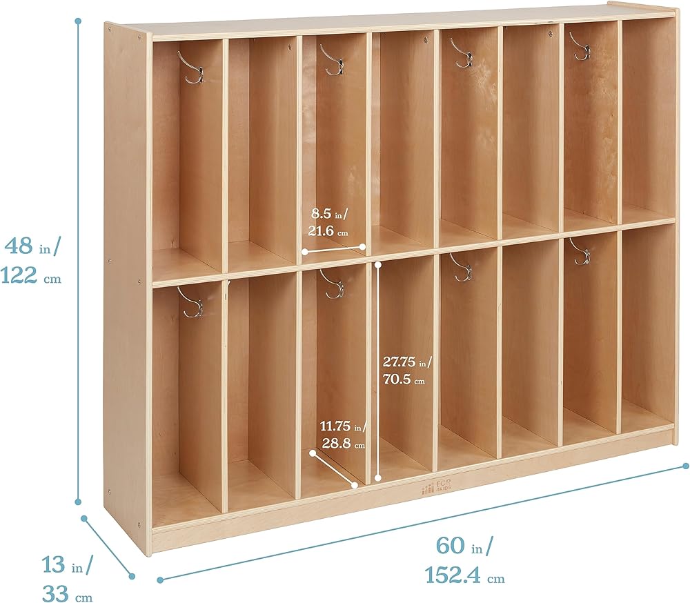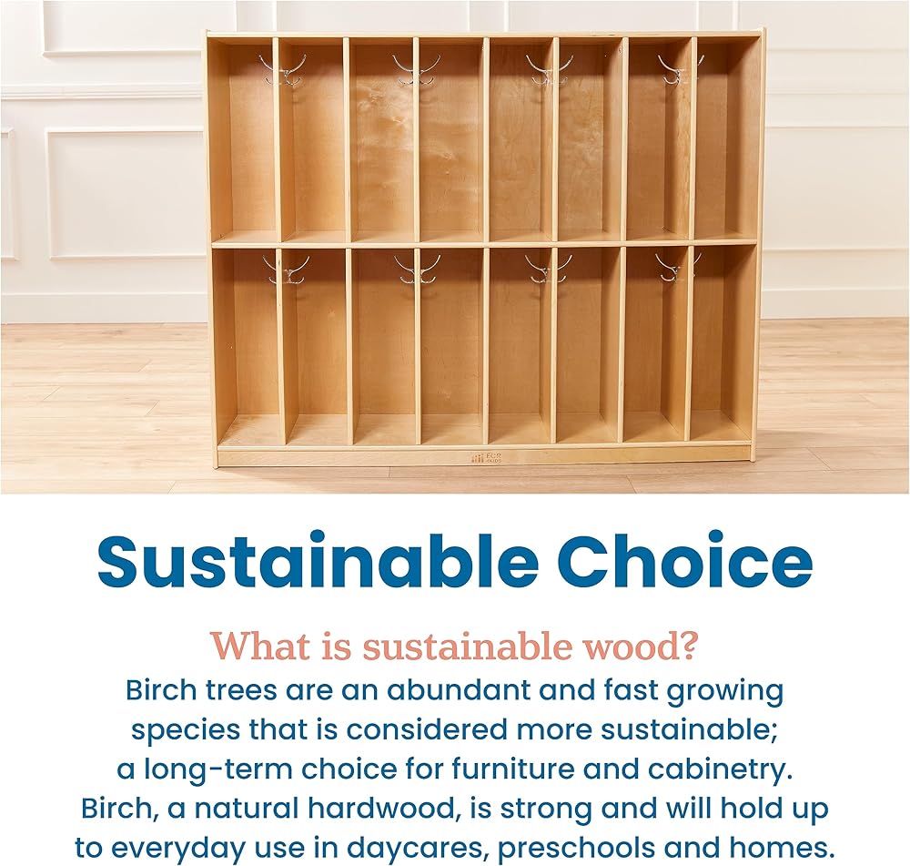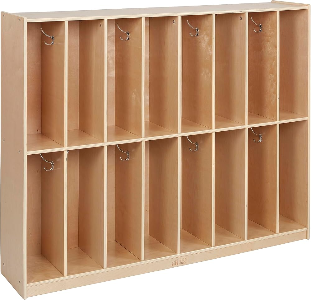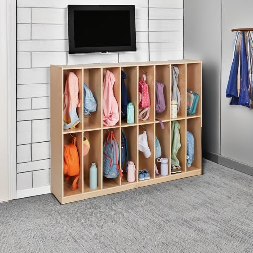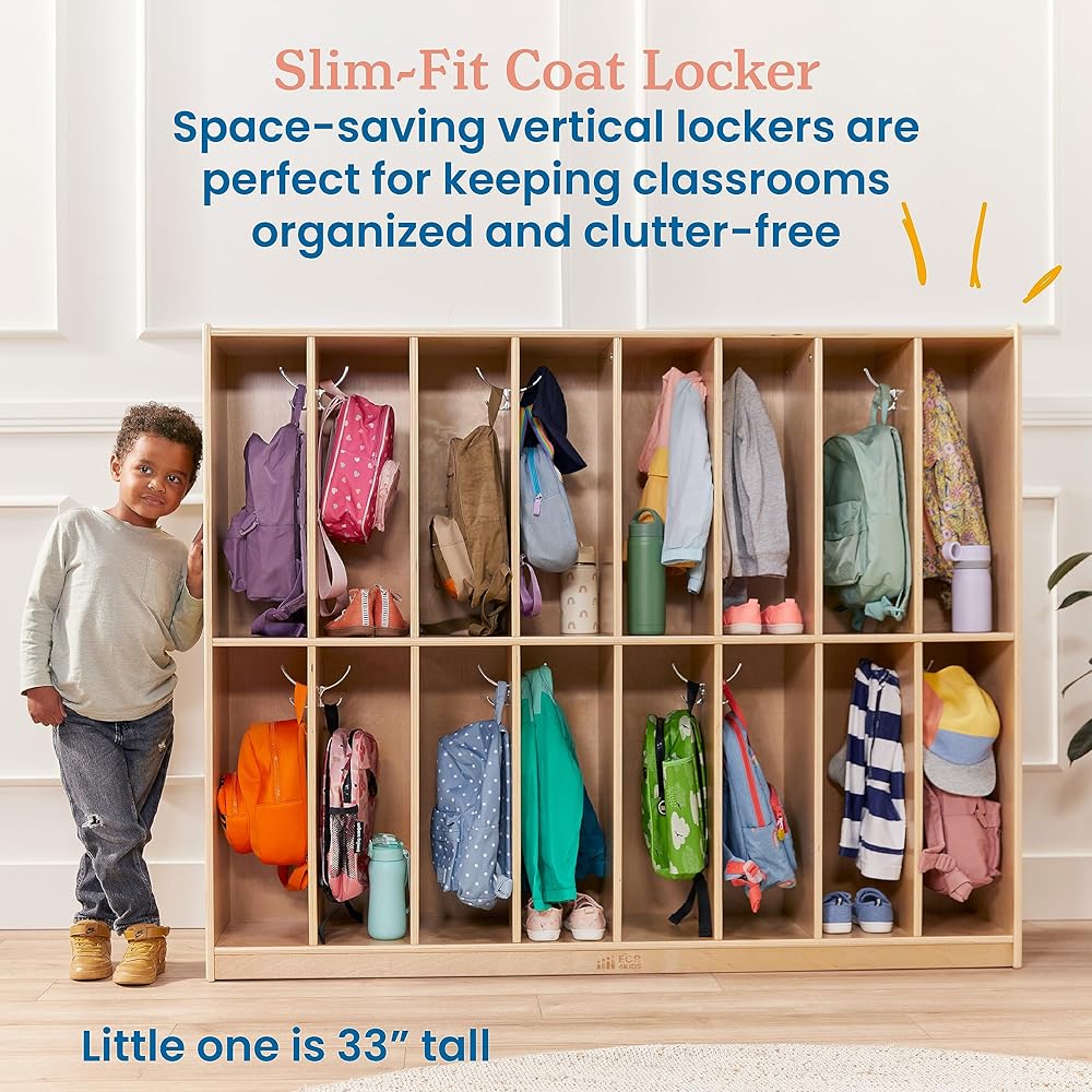 Provide a more efficient and productive learning environment with the ECR4Kids 16-Section Slim-Fit Coat Locker keeping it organized and clutter-free. The wooden locker features 16 long compartments with 16 double coat hangers to hang sweaters, backpacks, and umbrellas. Give children their own separate cubby storage to keep art projects, homework, and personal belongings. Use in a playroom to manage dress-up clothes, costumes, accessories, hats, gloves or in an entryway mudroom as a convenient place to grab coats and shoes as you head out the door. The low-profile open-face shelves provide visibility and easy access, promoting independence in kids as they take responsibility for their belongings and clean up. Having a dedicated space reduces clutter, enhancing classroom management. Constructed from sustainably harvested birch plywood with a durable finish sealing the wood surface and resisting scratching. A UV inhibitor helps furniture resist ultraviolet light and yellowing. Natural birch plywood is extremely durable and will hold up to everyday use in a preschool and is great for the home. Combine the Montessori storage with other ECR4Kids Birch Collection furniture pieces to complete the space.