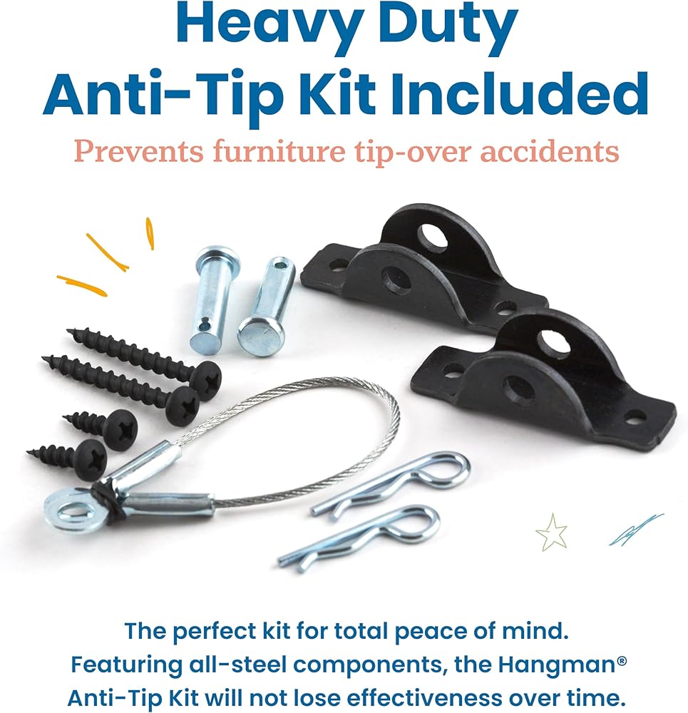 • Anti-Tip: Contains a heavy-duty HANGMAN Furniture Anti-Tip Kit featuring all-steel components; when properly installed using the attached instructions, prevents furniture tip-overs