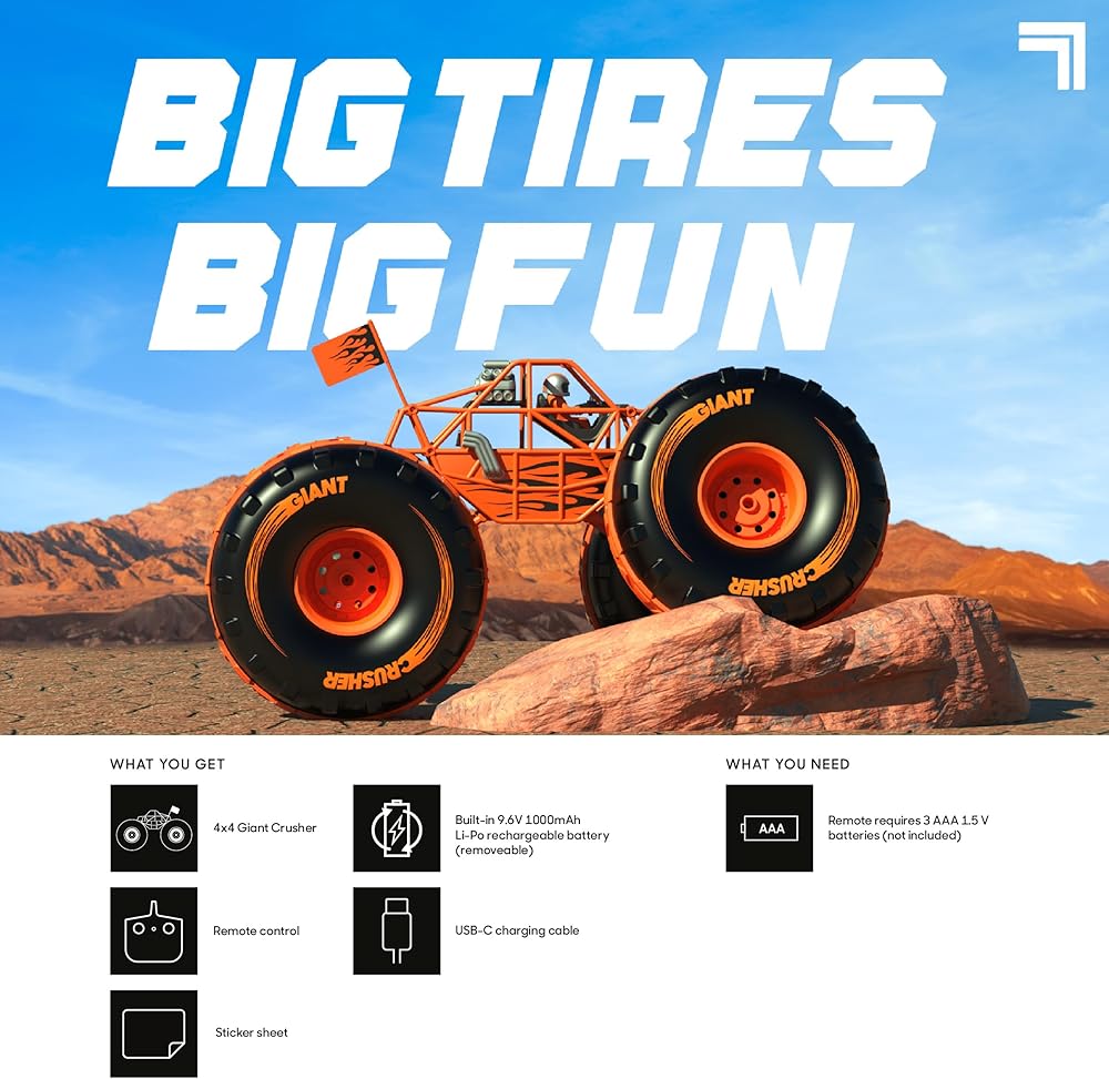 Keep the action going with a USB-C quick-charging battery that delivers up to 15 minutes of driving fun per charge and recharges in just 120 minutes. Effortlessly control your off-road 4x4 RC monster truck from up to 100 ft. away with the reliable and interference-free 2.4 GHz wireless range. Personalize your truck with the included sticker sheet and showcase your unique style as you dominate the great outdoors.