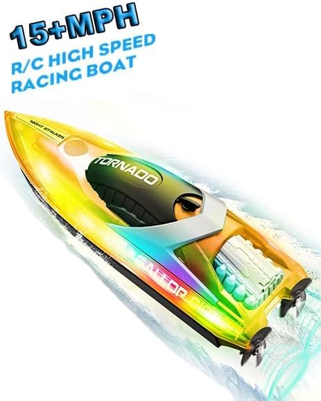 🛥 Fast RC Boat: الشكل الجميل المبسط لهد السفينة ، تم تجهيز هذا القارب عن بعد بأضواء ألوان رائعة. قارب RC للأطفال الذين يسافرون بسرعات تصل إلى 15 ميلًا في الساعة أو أعلى ، مزودة ببطاريتين قابلة لإعادة الشحن 1100 مللي أمبير في الساعة. حجم بدن ، 10*3.2*2.8 بوصة.