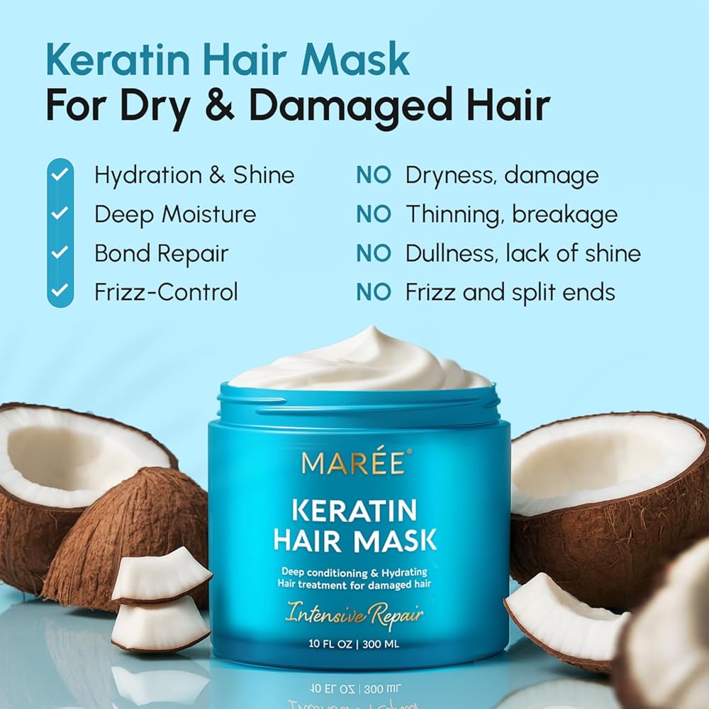 قناع الشعر العميق للشعر الجاف والنمو التالف: يتم غمر علاج الشعر ماري الكيراتين بالكراتين والبيوتين وزيت جوز الهند للشعر اللامع الناعم! قناع المكيفات والشعر الخاص بنا لترطيب الشعر المجعد وإصلاح الأقفال الحريرية!