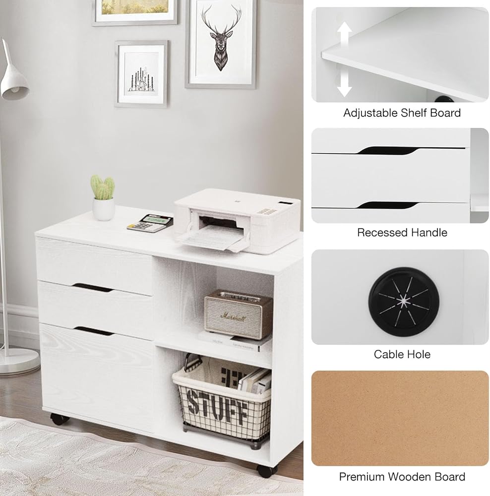 Sweetcrispy 3-Drawer File File Filed Failing Mobile Fluting Under Desk Storage Organizer with Wheels Printer Stand and Open Relves to Home Office ، Whitewood