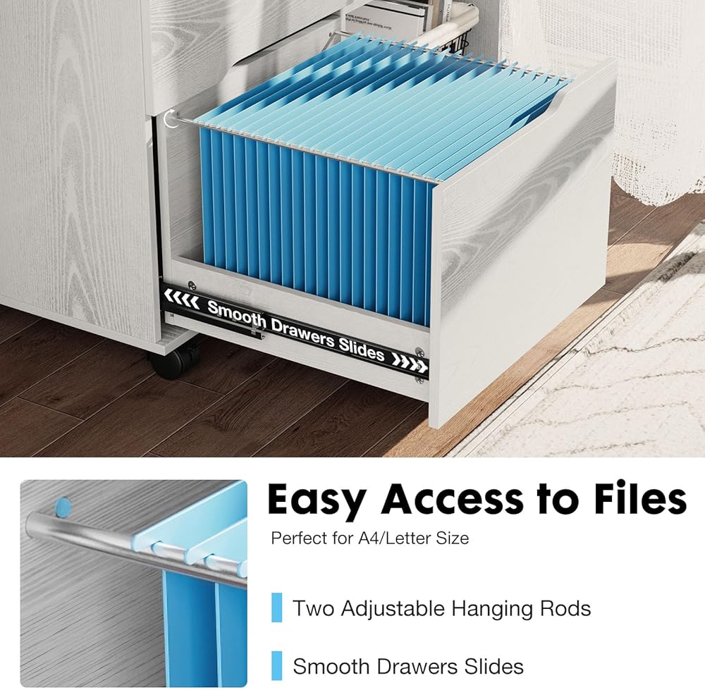 • 【Versatile Storage】Wood mobile file cabinet not only provides ample storage space, but also has versatility. The top drawer is suitable for storing office supplies, etc., while the bottom drawer provides greater space for storing legal documents, letters, or A4 sized documents. In addition, the desktop of the storage cabinet and the 2-layer open storage rack can accommodate your printer, scanner, or other office equipment, making your office space more tidy and orderly.