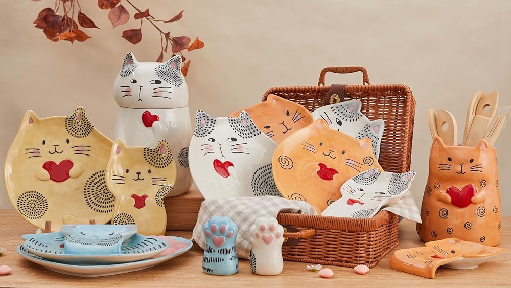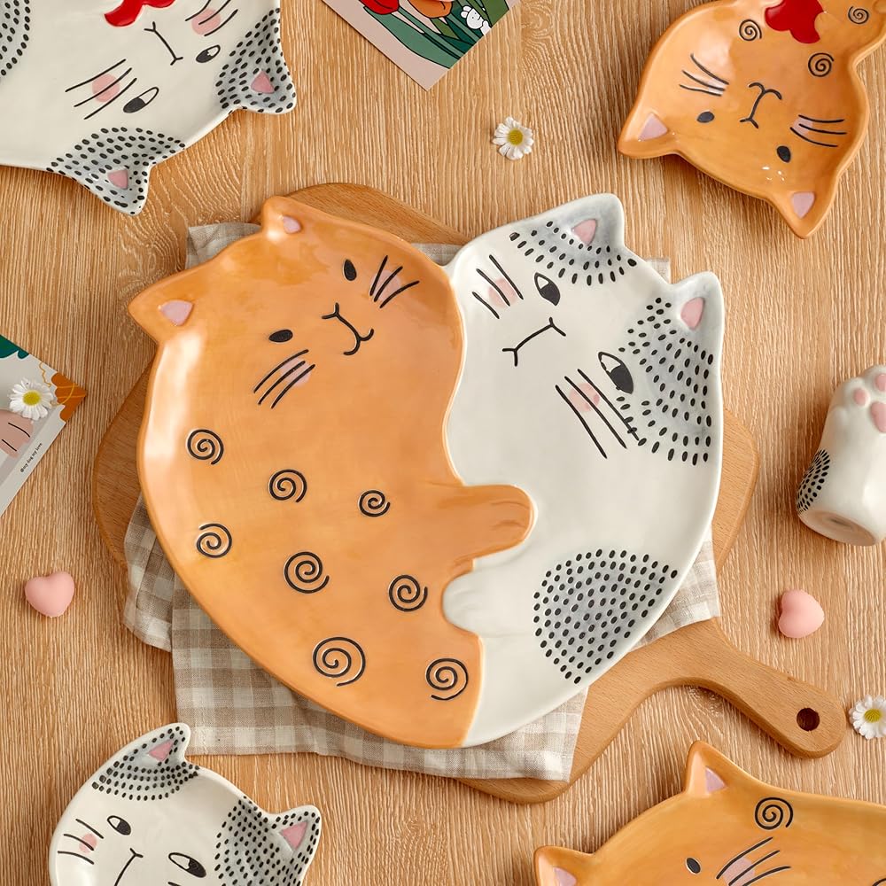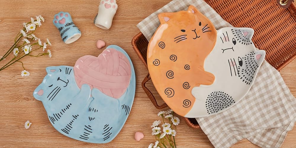 BICO Cartoon Cat عيد الحب يوم الحجري المصنوع يدويًا 11 بوصة لوحات عشاء ، مجموعة من 2 ، ميكروويف وغسالة الصحون آمنة ، للسلطة ، والحلويات ، والمعكرونة