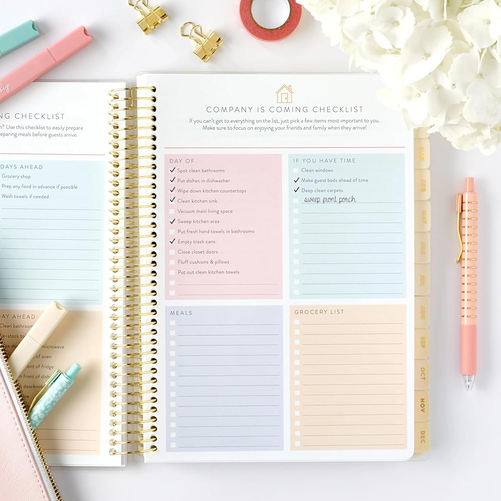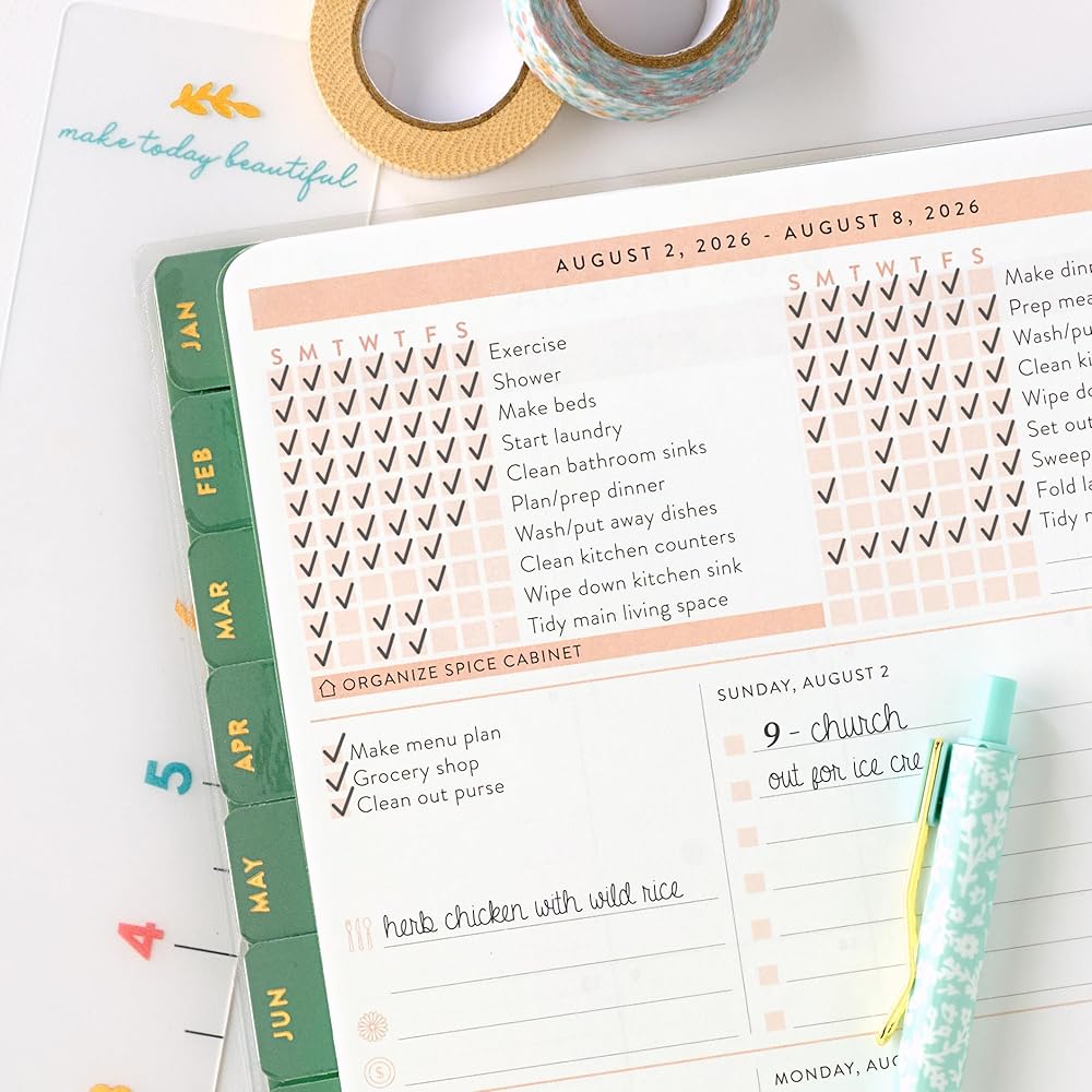 قوائم المراجعة اليومية - يساعدك هذا المخطط المنزلي على البقاء على مسار المهام اليومية الخاصة بك - ويشمل قوائم المراجعة المسبقة ، والصفحات الشخصية والعائلية ، ومساحة الميزانية والتوفير ، وتخطيط تقويم شهري (صفحتان في الشهر) وقوائم التحقق الأسبوعية (صفحتان في الأسبوع).