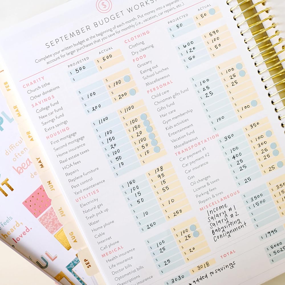 ورقة عمل الميزانية الشهرية - تتضمن جيبًا داخليًا للحفاظ على الإيصالات كجزء من الميزانية والوصول إلى المسار الصحيح مع أموالك. تساعدك ورقة العمل الشهرية على التخطيط للنفقات ومساحة جدول دفع فاتورة لإبقائك على تذكيرك.