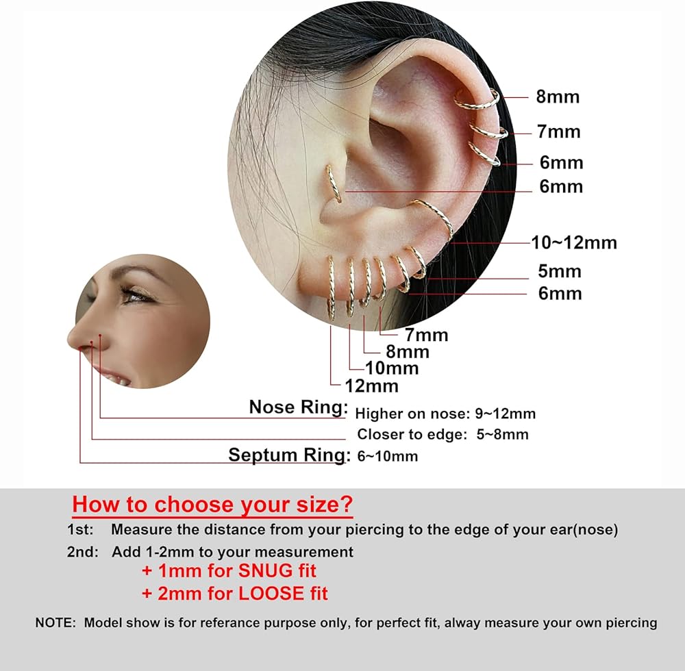 أقراط صغيرة متعددة الأغراض للنساء: أقراط ذهبية صغيرة للنساء للبنات ، يمكن أن تكون هذه الأقراط الذهبية هي حلق الغضروف ، وأطواق أنف ، وحلقات الحاجز ، ومجوهرات ثقب الأنف ، ومجوهرات ثقب تراغوس ، ومجوهرات هولكس ، وحلقات الشفاه ، والثالثة الثانية ... متعددة اختراق الأقراط الصغيرة ، وخلط وتتناسب مع مجموعة الدوران الذهب الخاص بك الآن. يرجى اتباع تعليمات القائمة لاختيار الحجم المناسب لك.