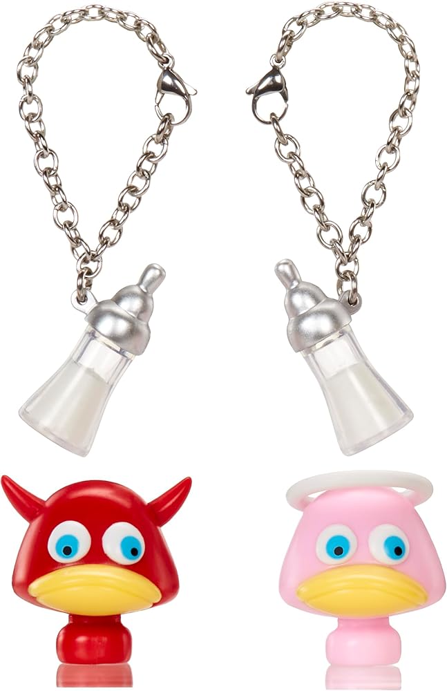 INCLUDES: 2 Bratz Babyz dolls with fashion outfits, 2 baby bottle necklace/keychains, and 2 pets.