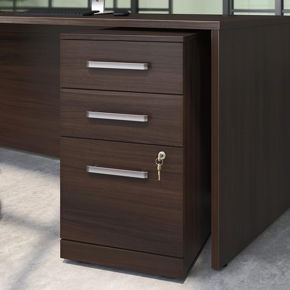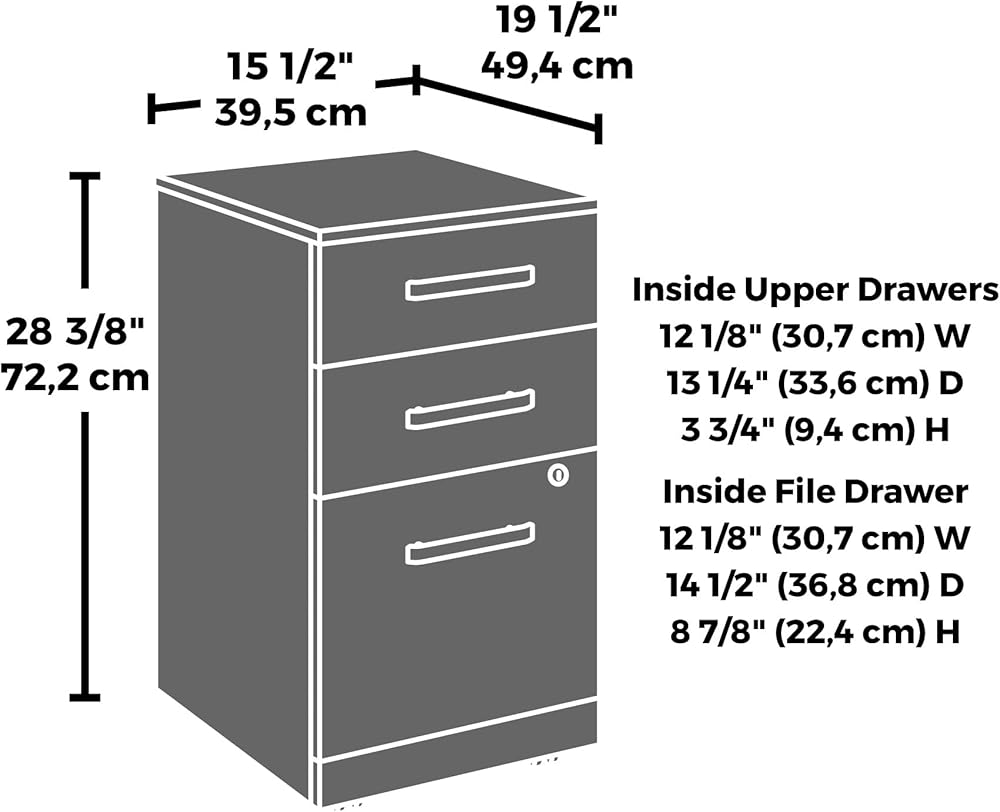 Bring a classic office feel with a modern office pedestal file cabinet from the Affirm® collection. This 3-drawer pedestal file cabinet comes fully assembled, with minimal hardware attachment required. Less strain on assembling, and more time is spent organizing and arranging your new commercial filing cabinets. Two small drawers with metal runners and safety stops are ideal for storing office essentials like note cards, sticky notes, your pens, and more. The locking, lower drawer of this file cabinet features full extension slides and holds letter or European size hanging files, ensuring that your documents are easy to find and secured. This commercial filing cabinet includes an interlocking safety mechanism that prevents all drawers opening at the same time. Hidden casters for easy movement around the office allow you to easily rearrange your space with your mobile file cabinet. This file pedestal is finished on all sides for versatile placement at the office—it will look complete no matter how you arrange it. Finished in a Noble Elm™, this commercial 3-drawer pedestal file cabinet upgrades your office space.