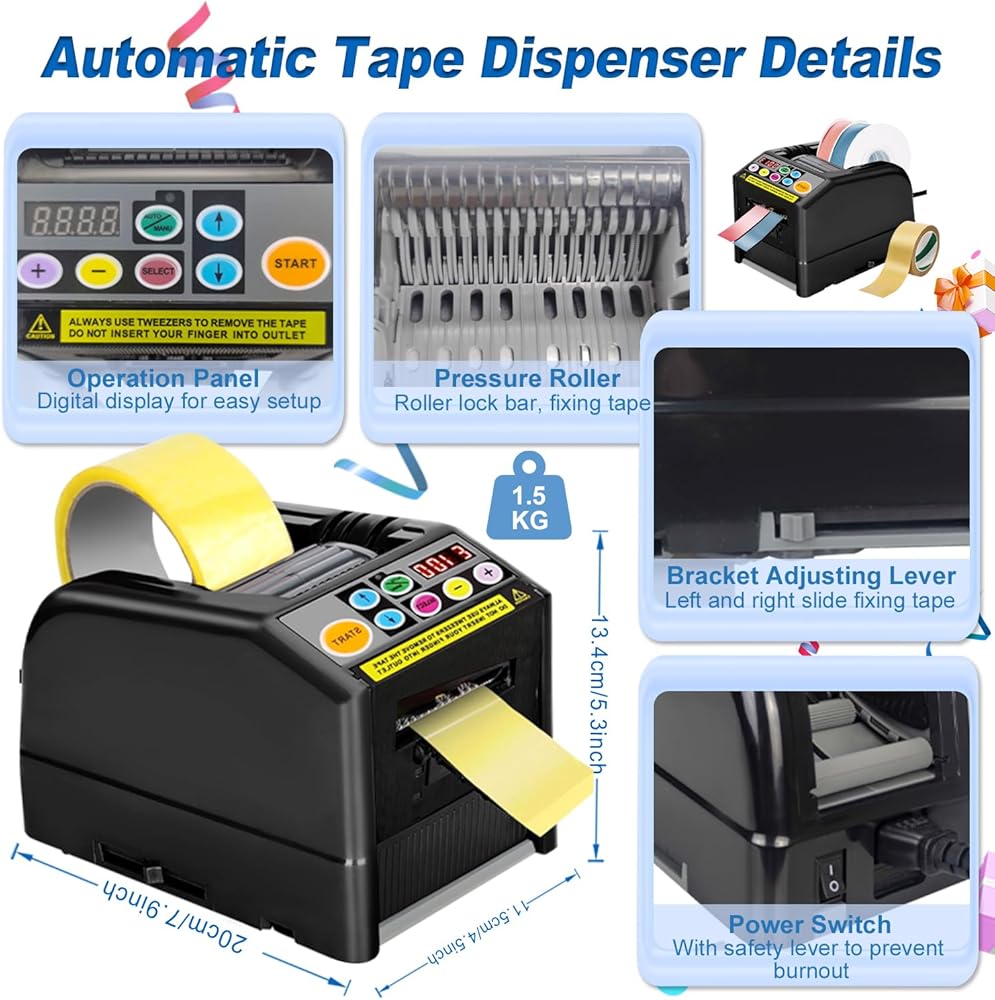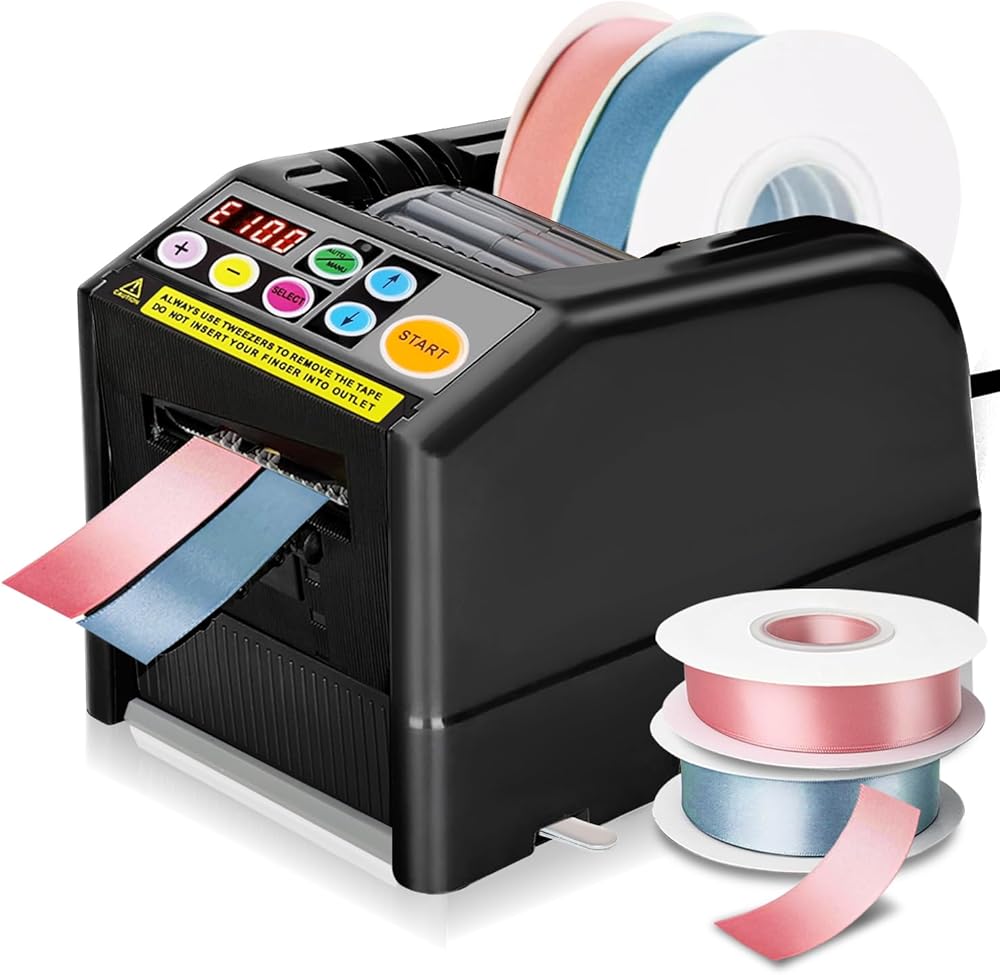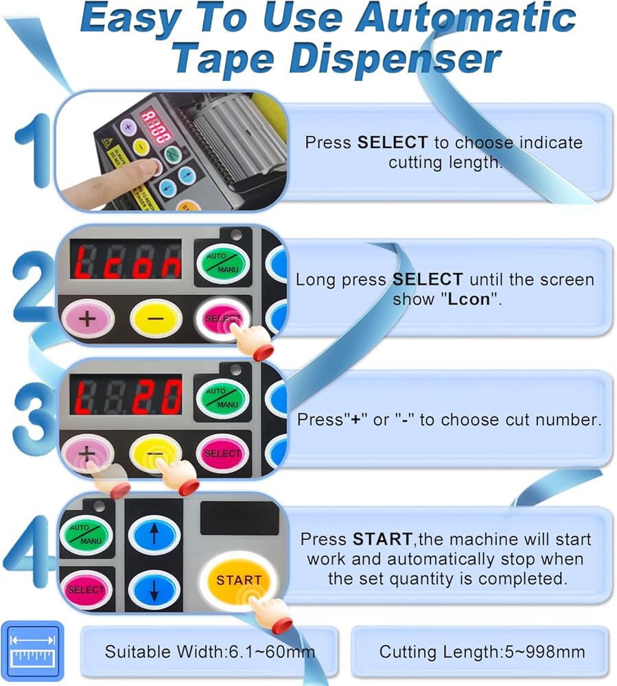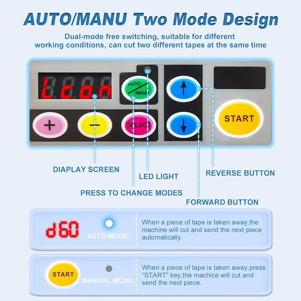 【Wide Range Of Applications】Upgraded the automatic tape dispenser from plastic material to weak sticky silicone material to minimize tape adhesive residue and improve cutting performance.upgrade ribbon cutting machine is suitable for most tapes, such as ribbon, high temperature tape, transparent tape, double-sided tape, fiber tape, electrical tape, strong tape etc.The automatic tape machine is suitable for cutting tapes with a thickness limited to 0.5mm and a width limited to 6-60mm.【Intelligent Cutting】Automatic tape dispenser smart sensor cutting, cutting more precise, the cut is smoother. The automatic tape dispenser can set 6 different cutting lengths and quantities, and preset cutting times. The ribbon cutter has a memory function and does not need to be set again even if it is restarted. The automatic tape cutting machine can preset the maximum cutting length to 999mm. If two rolls of tape are cut at the same time, the sum of the width of the tape must be equal to or within 60mm.【Convenient Automatic/Manual Mode】The automatic tape dispenser cutting machine can switch automatic and manual modes to meet different needs.In automatic mode,make sure that the led lamp is flashing,Press the start button once, ribbon cutting machine will feed-in a piece of tape then cut it out based on your set length;in manual mode,make sure that blue led lamp is off,To cut another piece, press start button again.If you need to cut ribbons, please use the "Lcon" mode,you can check the manual page 10 for details.【Easy To Operate】Automatic tape dispenser cutting machine with built-in smart sensor,just load one or two rolls of suitable tape in the Ribbon Cutting machine, select the set length and mode,press the start button to complete the cutting.using this tape dispenser will save you a lot of time and increase efficiency in your packaging tasks.the automatic tape dispenser is suitable for different places: holiday decoration,warehouse,office, retail store, florist,cake shop etc.【Warm Tips】Please read the instructions carefully before using the automatic tape dispenser cutting machine. If the automatic tape dispenser does not work properly, The buzzer will has a sound then a message will flash and show on the display,You can view the manual to solve the fault according to the fault code on the display.After clearing the obstacle, you need to press the start button again to continue working.