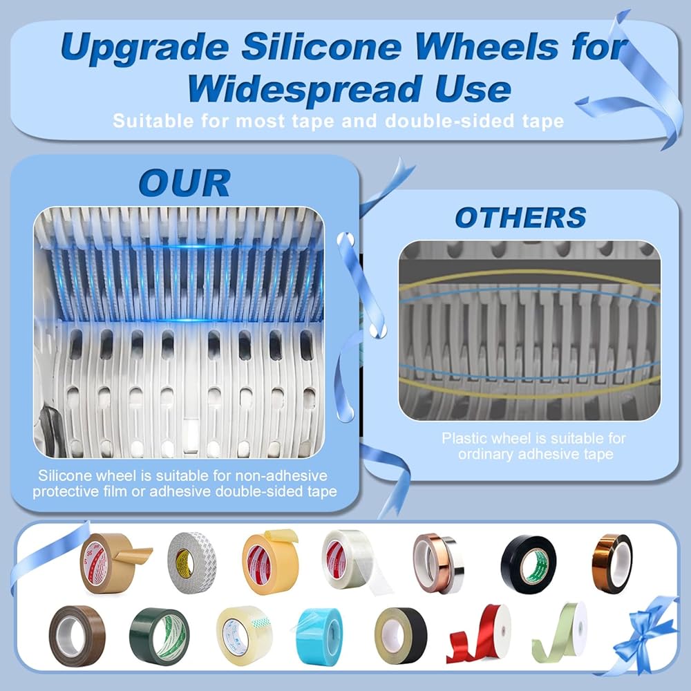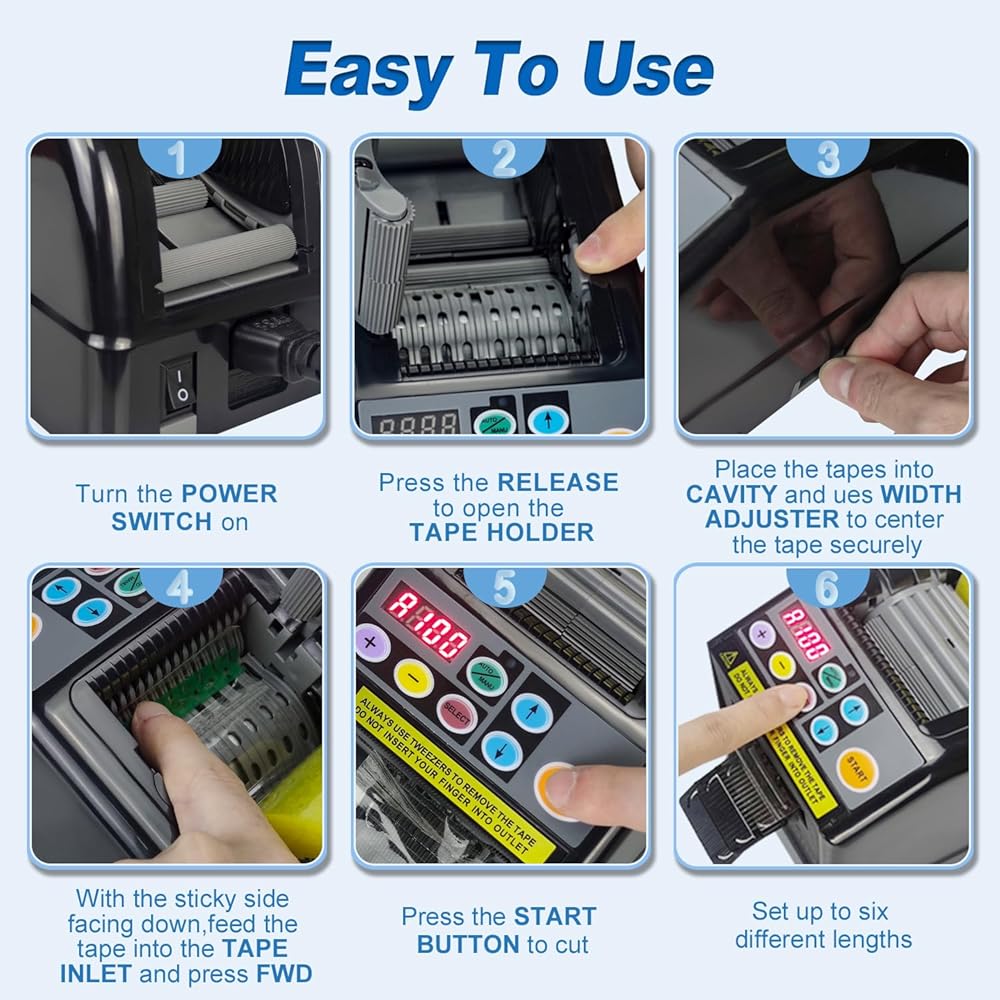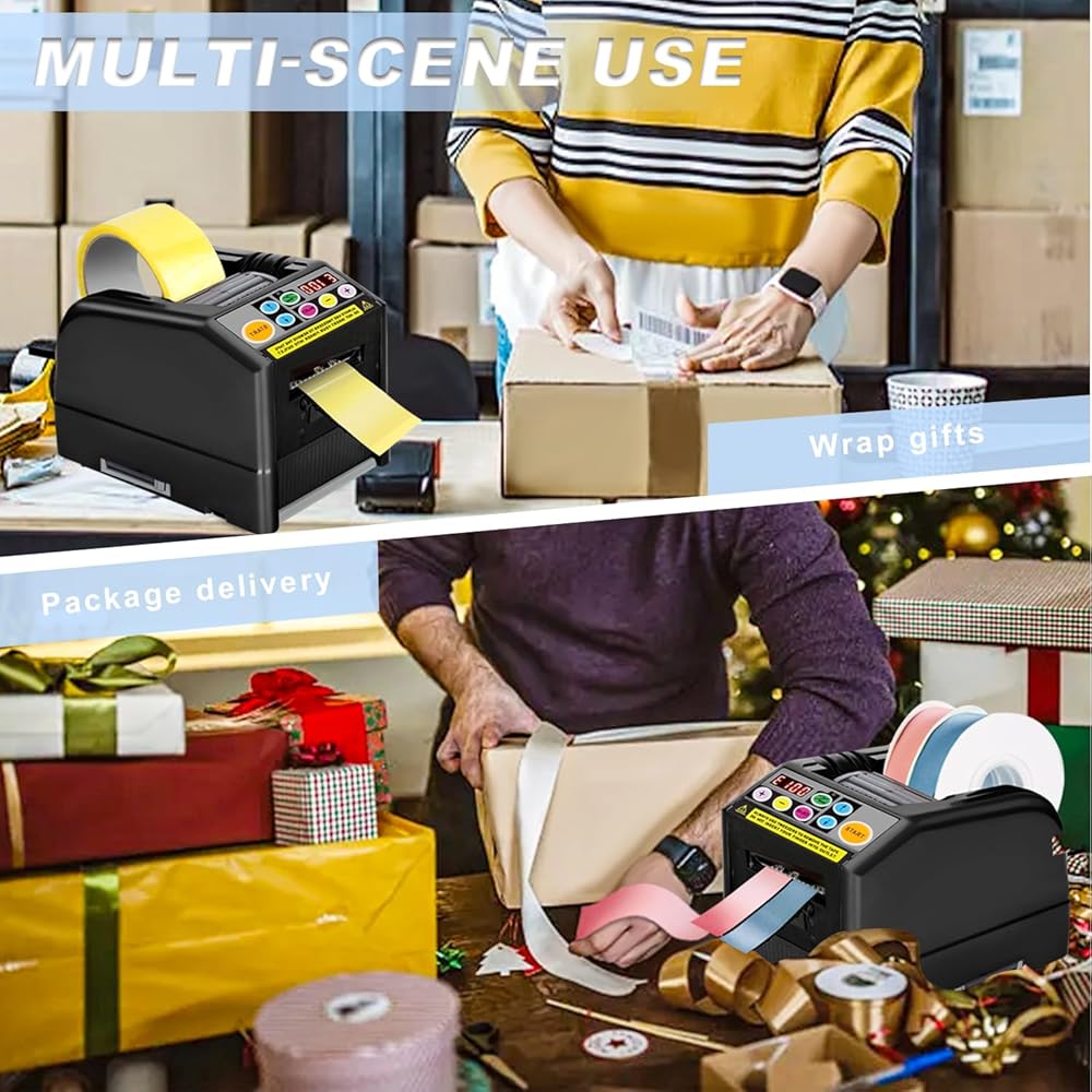 【Wide Range Of Applications】Upgraded the automatic tape dispenser from plastic material to weak sticky silicone material to minimize tape adhesive residue and improve cutting performance.upgrade ribbon cutting machine is suitable for most tapes, such as ribbon, high temperature tape, transparent tape, double-sided tape, fiber tape, electrical tape, strong tape etc.The automatic tape machine is suitable for cutting tapes with a thickness limited to 0.5mm and a width limited to 6-60mm.【Intelligent Cutting】Automatic tape dispenser smart sensor cutting, cutting more precise, the cut is smoother. The automatic tape dispenser can set 6 different cutting lengths and quantities, and preset cutting times. The ribbon cutter has a memory function and does not need to be set again even if it is restarted. The automatic tape cutting machine can preset the maximum cutting length to 999mm. If two rolls of tape are cut at the same time, the sum of the width of the tape must be equal to or within 60mm.【Convenient Automatic/Manual Mode】The automatic tape dispenser cutting machine can switch automatic and manual modes to meet different needs.In automatic mode,make sure that the led lamp is flashing,Press the start button once, ribbon cutting machine will feed-in a piece of tape then cut it out based on your set length;in manual mode,make sure that blue led lamp is off,To cut another piece, press start button again.If you need to cut ribbons, please use the "Lcon" mode,you can check the manual page 10 for details.【Easy To Operate】Automatic tape dispenser cutting machine with built-in smart sensor,just load one or two rolls of suitable tape in the Ribbon Cutting machine, select the set length and mode,press the start button to complete the cutting.using this tape dispenser will save you a lot of time and increase efficiency in your packaging tasks.the automatic tape dispenser is suitable for different places: holiday decoration,warehouse,office, retail store, florist,cake shop etc.【Warm Tips】Please read the instructions carefully before using the automatic tape dispenser cutting machine. If the automatic tape dispenser does not work properly, The buzzer will has a sound then a message will flash and show on the display,You can view the manual to solve the fault according to the fault code on the display.After clearing the obstacle, you need to press the start button again to continue working.