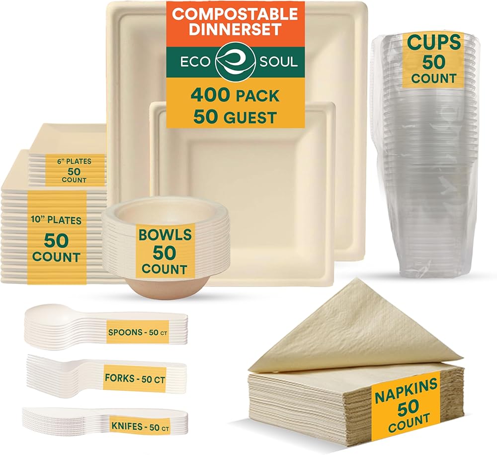 𝐂𝐎𝐌𝐏𝐋𝐄𝐓𝐄 𝐃𝐈𝐍𝐍𝐄𝐑𝐖𝐀𝐑𝐄 𝐃𝐈𝐍𝐍𝐄𝐑𝐖𝐀𝐑𝐄 𝐒𝐄𝐓: تشتمل هذه المجموعة المكونة من 200 قطعة على 25 لوحات قابلة للتحلل 6 بوصات ، و 25 لوحات قابلة للتحلل ، و 25 أوعية ، و 25 أكوابًا باردة ، و 25 منديلًا قابلاً للتسميد ، ومجموعة Cetlery من 75 قطعة (شوك ، سكاكين ، ملاعق) ، مما يجعلها مثالية للحفلات والتخييم والنزهات والمزيد.