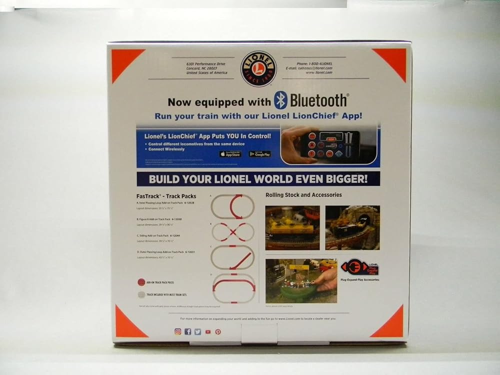 LOCOMOTIVE FEATURES: Electric locomotive controlled by included LionChief remote, LionChief Universal Remote (sold separately) or Bluetooth LionChief app, On/Off switch for smoke and sound, RailSounds RC sound system with steam chuffing and background sounds, whistle, bell, and user-activated announcements, Operating headlight, Powerful maintenance-free motor, Operating couplers