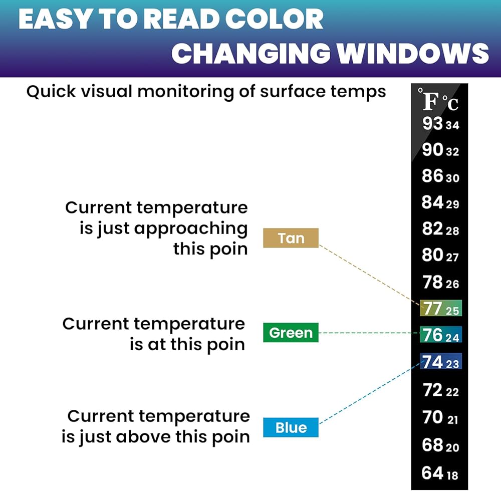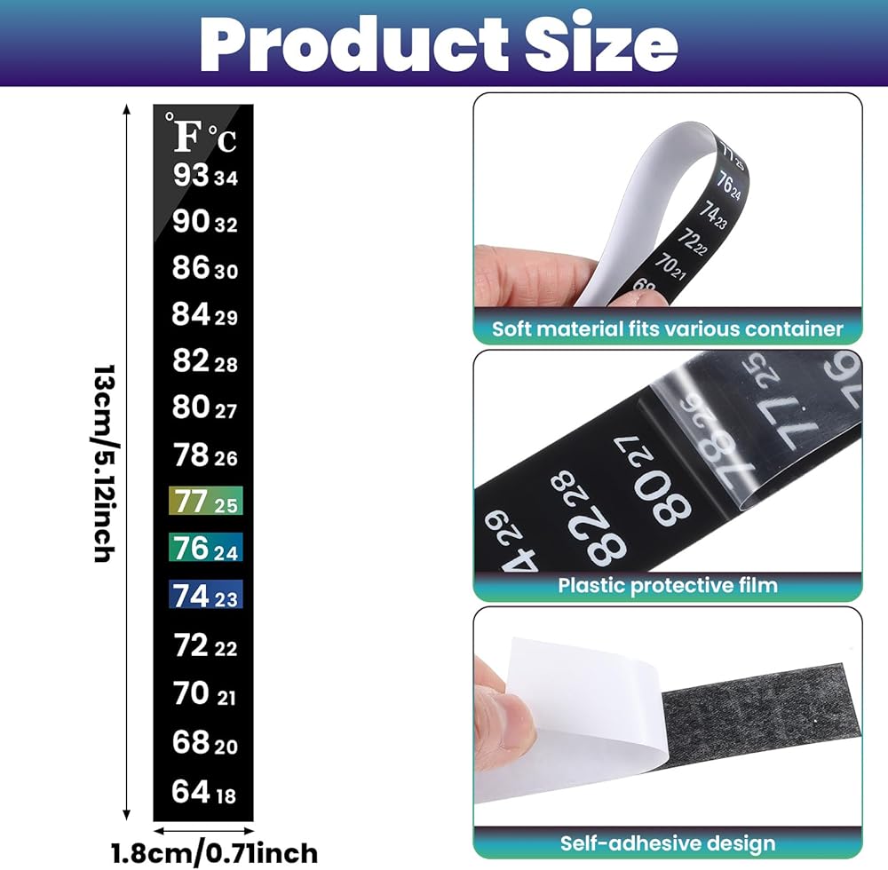 Clear and Easy-to-Read: The stick on thermometer strip features a clear, easy-to-read display that shows the temperature in both Celsius and Fahrenheit. The temperature sticker ensures you can quickly and accurately check your tank's conditions at a glance.