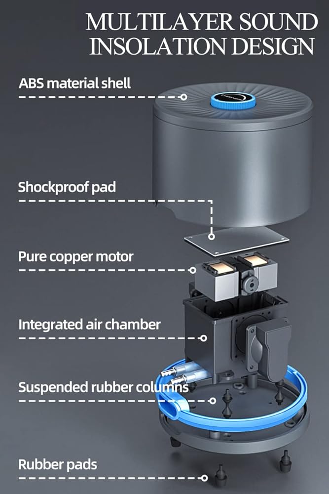 توفير الطاقة: يتم تشغيل مضخة هواء الحوض بواسطة أجواء كهرومغناطيسية (4W) ، الأسطوانات والمكابس مصنوعة من مواد متميزة ، مما يجعل المضخة قوية وفعالة للغاية ، يمكنك تركها للعمل على مدار الساعة طوال أيام الأسبوع.