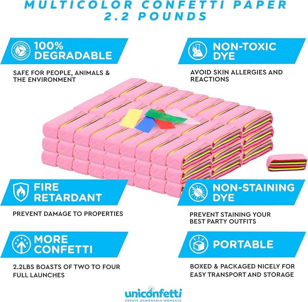 Our 2.2lbs or 1kg pack of biodegradable multicolor tissue paper brings a rainbow of joy to any occasion. Celebrate Responsibly with 100% Biodegradable Confetti! Our confetti is crafted from lightweight, fire-resistant papers, ensuring a safe and eco-friendly addition to your festivities. Made from non-toxic color dye, you can party with peace of mind knowing it won't transfer onto your clothing. Perfectly safe for both your event and the environment. Let the celebration begin with guilt-free, colorful fun!
