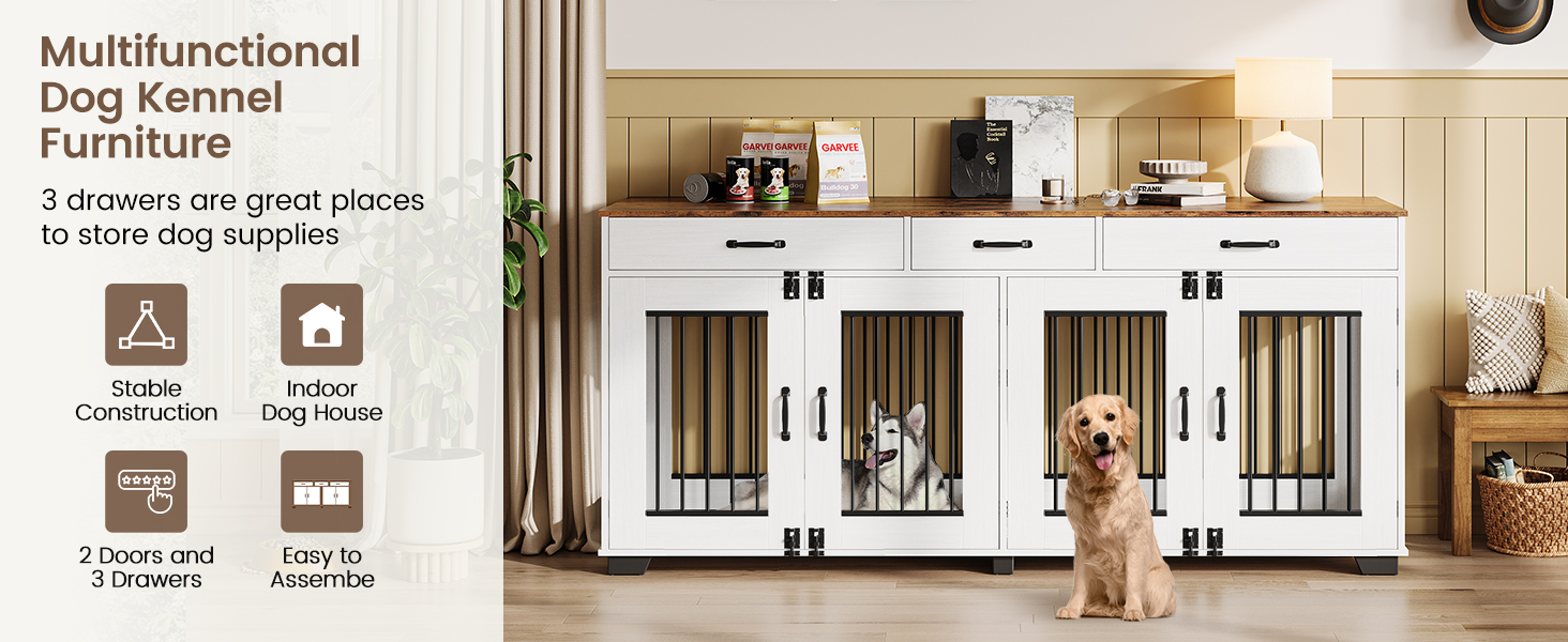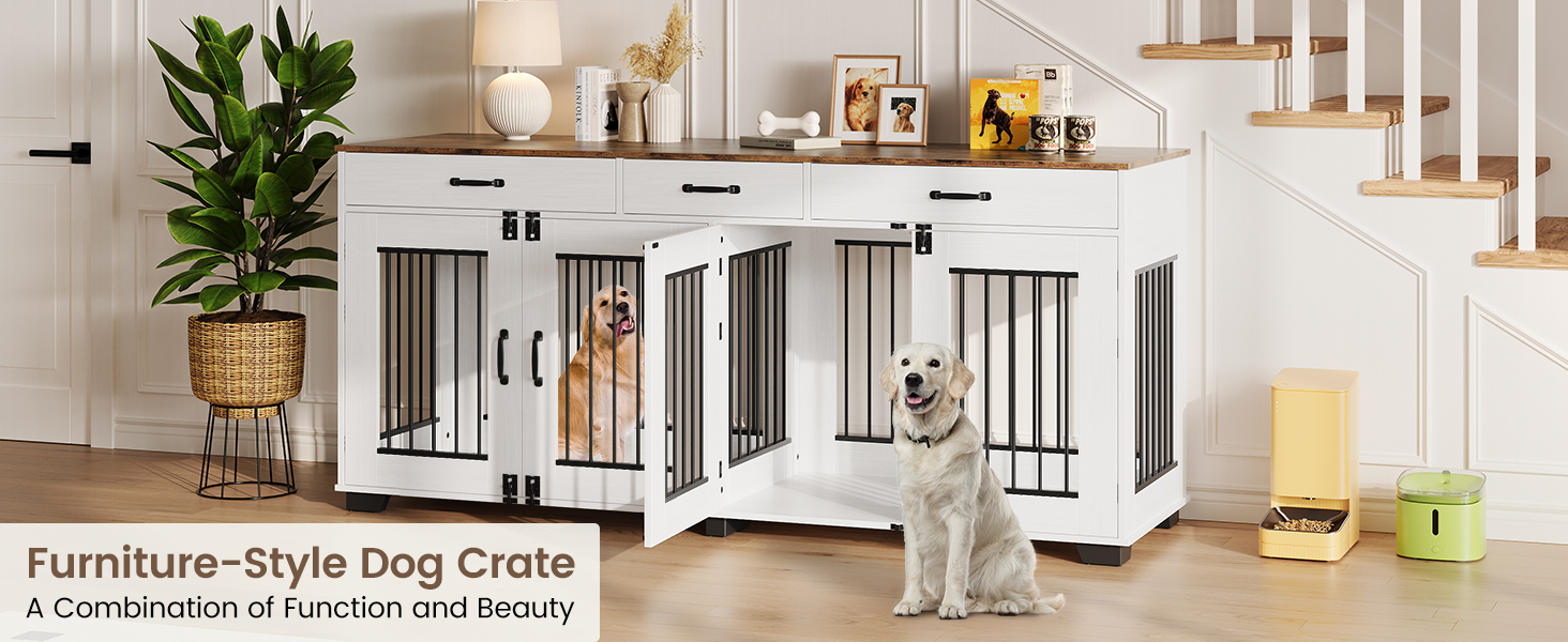 Gaomon 71 بوصة أثاث قفص الكلب الكبير للكلاب 2 ، خشبية مزدوجة الكلب قفص سلالة كبيرة مع الباب ، بيت الكلب الداخلي ، طاولة طاولة تلفزيونية مع مقسم للكلاب المتوسطة الكبيرة ، بيضاء/بنية
