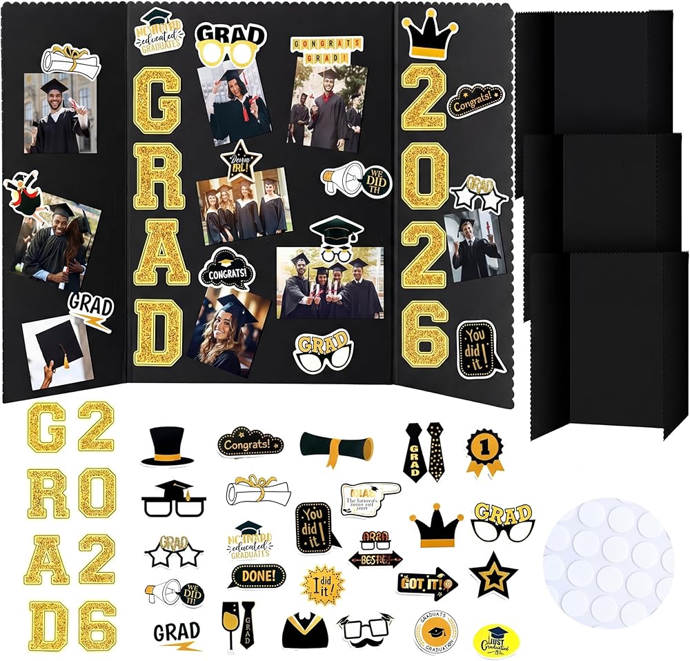 • Ready to Use Package: these graduation trifold poster boards arrive in a package that includes 4 trifold poster boards (with 2 glue), 4 [GRAD 2025] glitter cardboard, and an engaging set of 52 graduation themed stickers; This complete pack ensures you have everything you need for your presentation