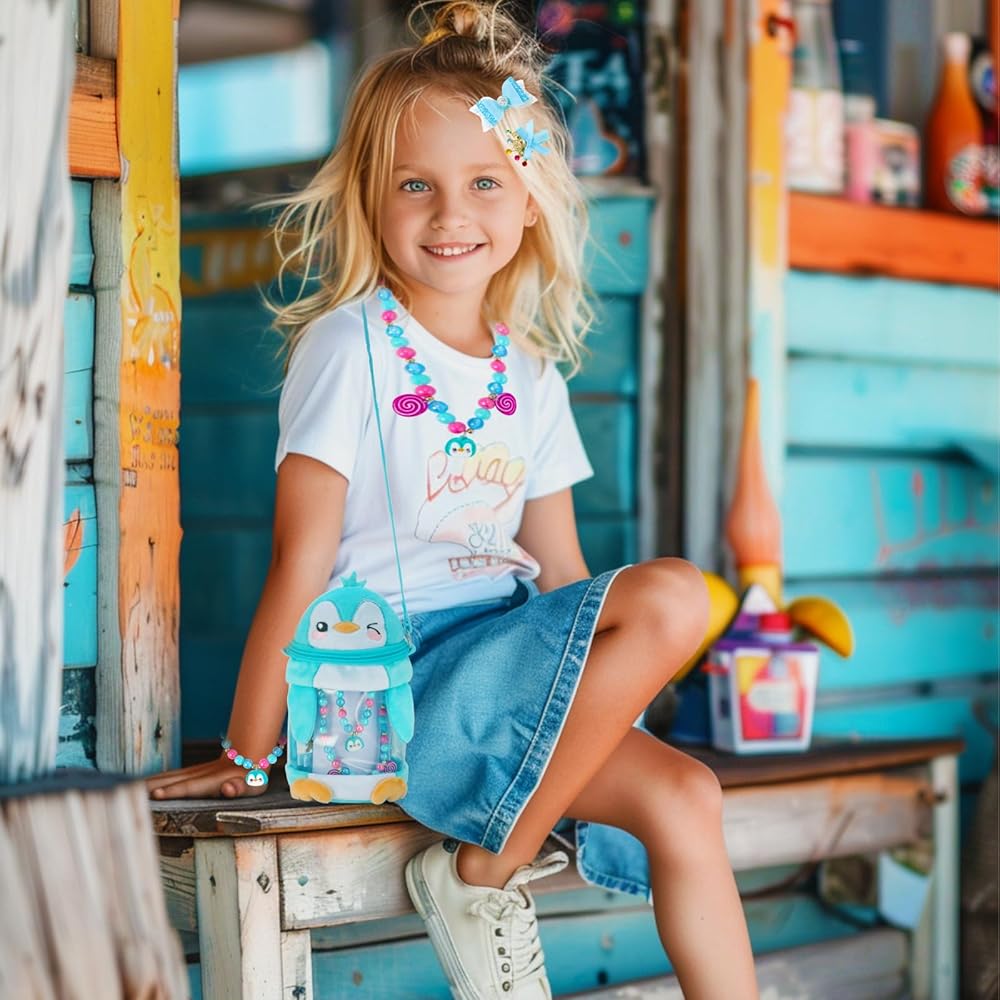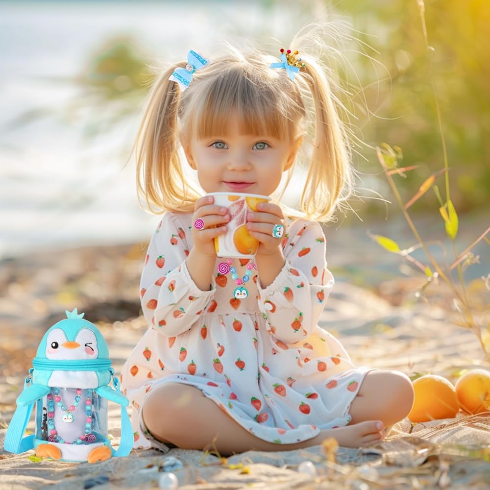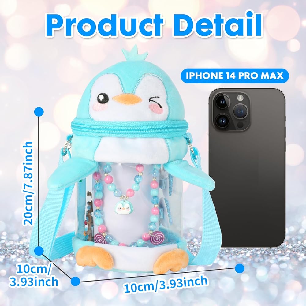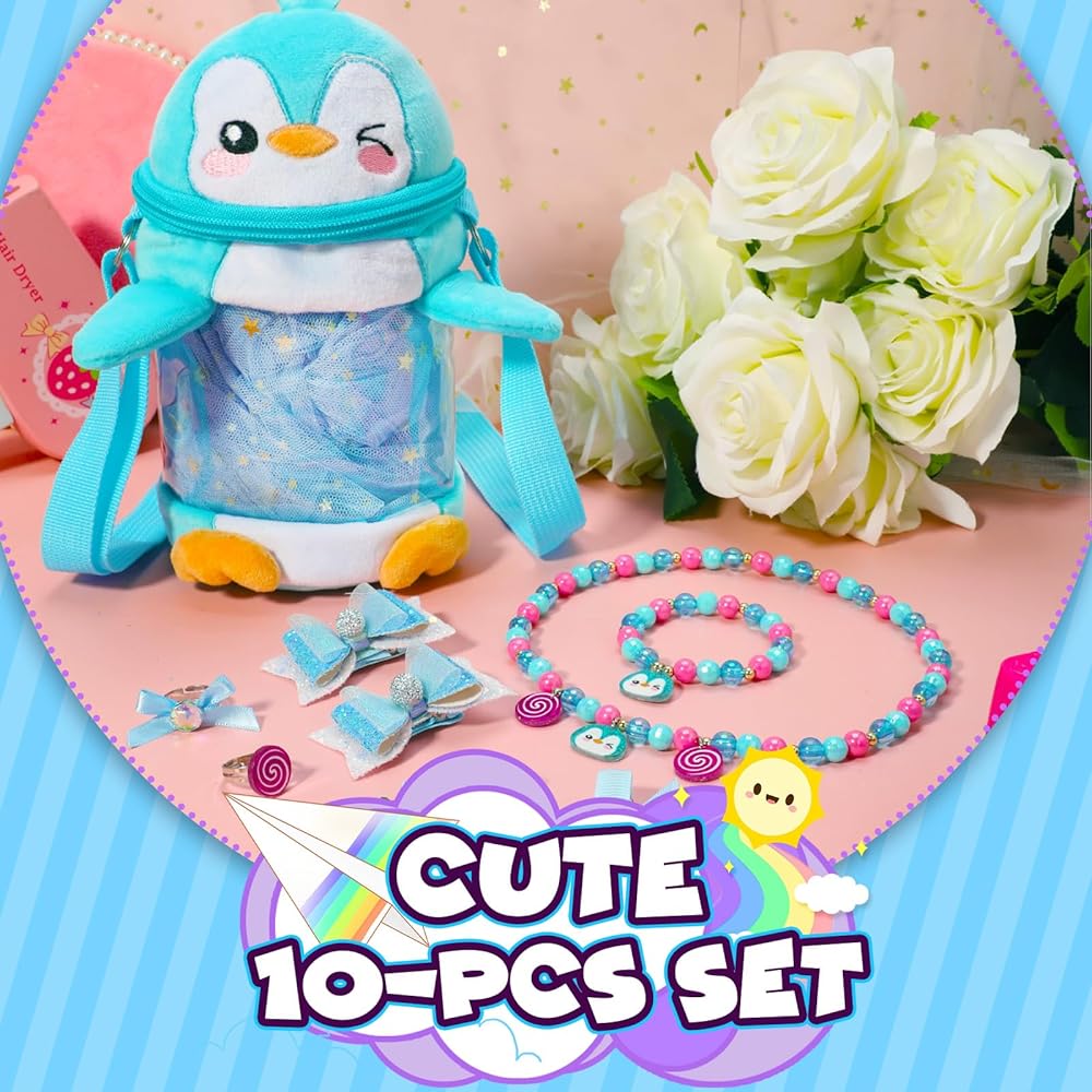 【Blue Penguin Design】The PinkSheep little girls toy jewelry set, Incorporate blue plush penguin into bags, necklaces, bracelets, and accessories,Dressing up with penguin jewelry not only makes children look cuter in Christmas, but also accompanies them like friends, giving them a warm and sweet feeling