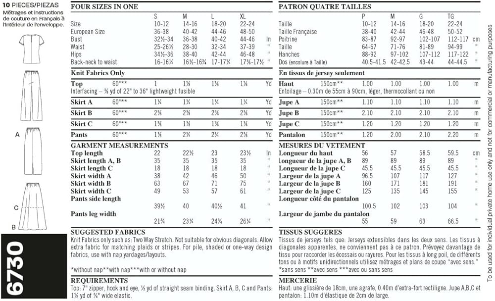 Suggested fabrics: Knit fabrics only such as: 2-Way Stretch, Not suitable for obvious diagonals; allow extra fabric for matching plaids or stripes; for pile, shaded or 1-way design fabrics, use with nap yardages/layouts
