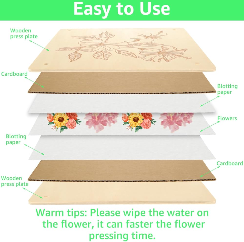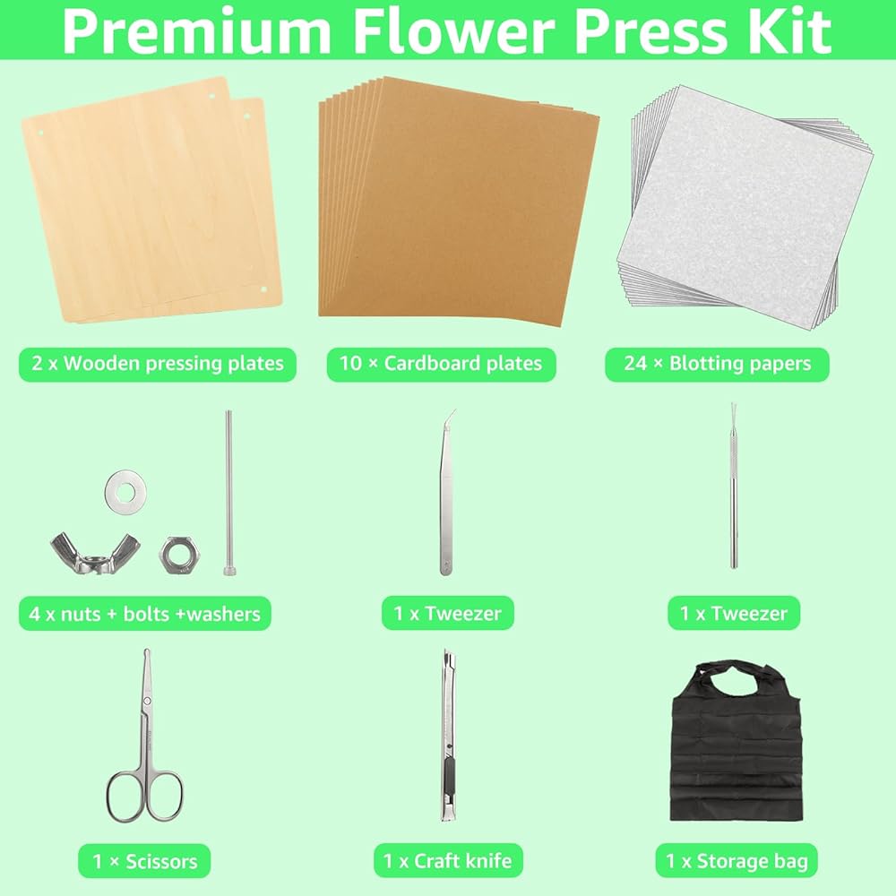 【تشمل الحزمة】 تأتي مكبس الزهور مع لوحين من الصحافة الخشبية ، 10 طبقات من البطاقات ، 24 ورقة نشاف ، حقيبة حمل محمولة واحدة ، 1 سبعة إبرة ، ملاقط ، مقص واحد ، سكين واحد ، تعليمات مفصلة واحدة لمساعدتك على بدء الرحلة بنجاح في بدء الرحلة بنجاح من الضغط على الزهور