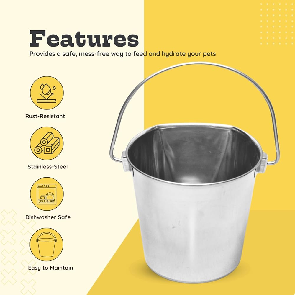 متين ومقاوم للصدأ: مصنوع من الفولاذ المقاوم للصدأ عالي الجودة ، تم تصميم هذا الدلو لتحمل الاستخدام اليومي ومقاومة الصدأ ، مما يضمن المتانة طويلة الأمد للطعام والماء.