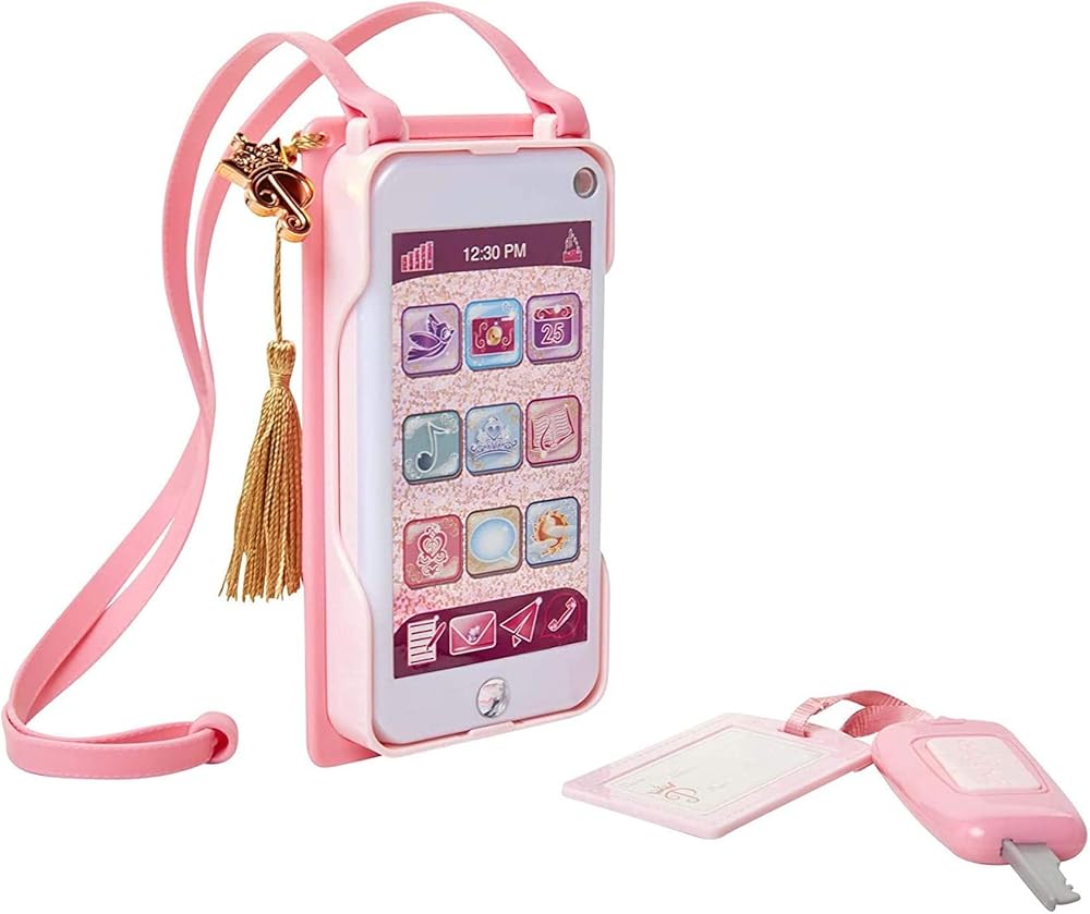 Includes: play smartphone with LED lights and sounds, cross-body wallet case, key fob, 2 plastic play credit cards, and ribbon with Castle charm