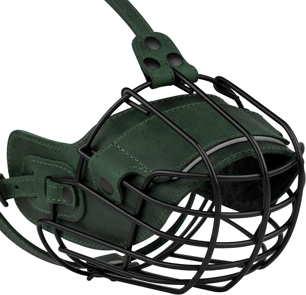 Adjustable Leather Straps: Featuring adjustable leather straps, this basket muzzle ensures flexibility, secure fit, and enhanced visibility in low-light conditions for added safety during evening walks. The metal construction keeps it securely in place without being easily dislodged.