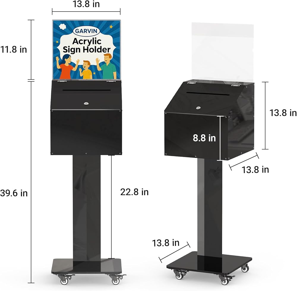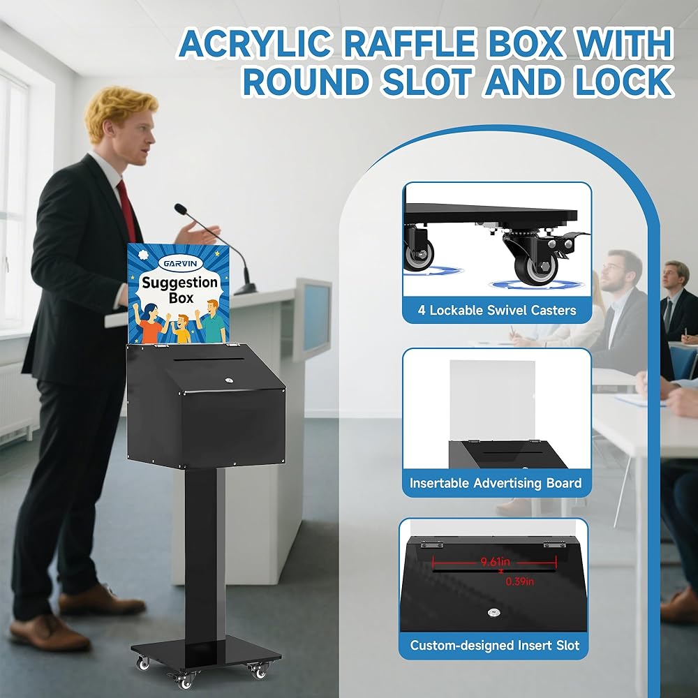 Durable & Secure Made from high-quality, shatter-resistant acrylic with a lockable design to keep contents secure. Easy to Move Equipped with four caster wheels (two lockable) for easy movement and secure placement. Modern Design Sleek and transparent, this suggestion box blends into any environment, perfect for offices, churches, and public spaces. Versatile Usage Ideal for voting, donations, feedback, and more—perfect for events, schools, charities, and businesses. Secure Storage Includes a lock and keys to protect your donations, votes, or suggestions from unauthorized access.