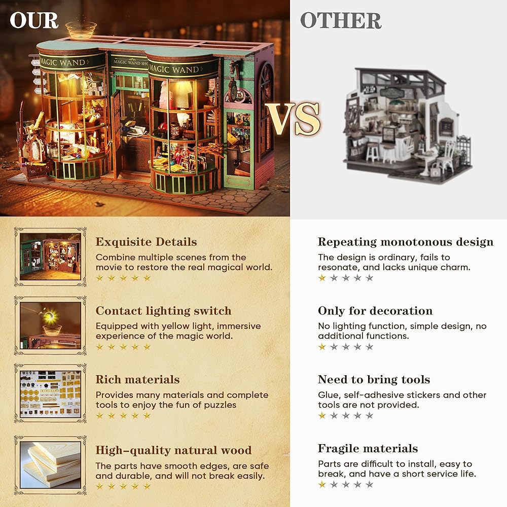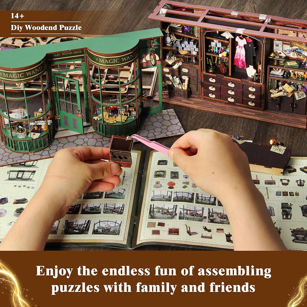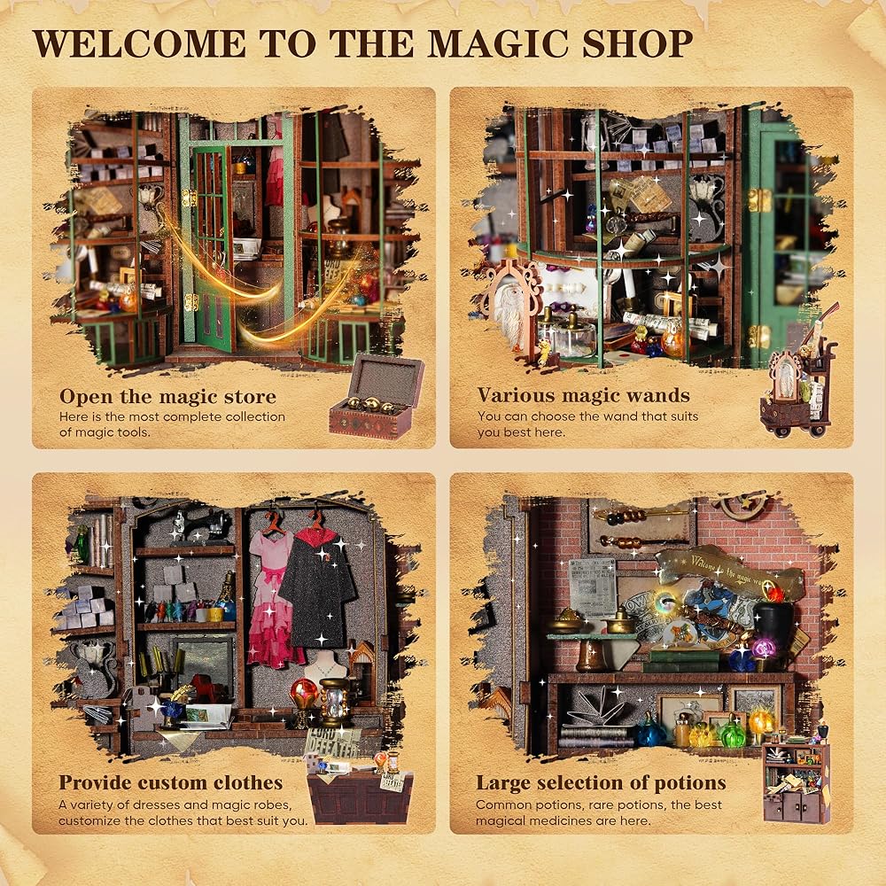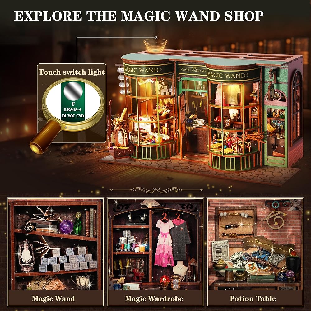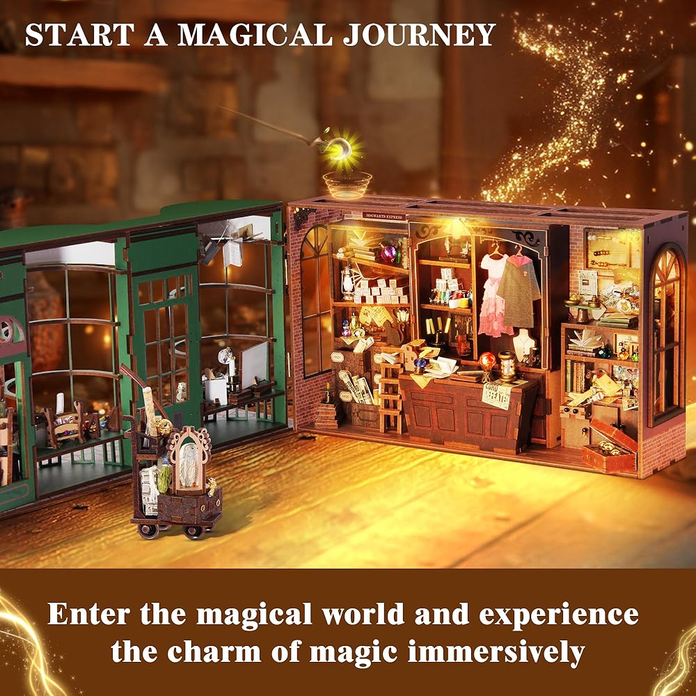 Perfect Decoration & Great Gift: This 11.3*5.1*5.9in book nook kits for adults perfectly presents the interior structure of the entire wand shop. The ingenious design and exquisite details are amazing. It is an indispensable collection and decoration for magic lovers, model collectors and teenagers. It is the best gift choice for birthdays, Christmas and other festivals!
