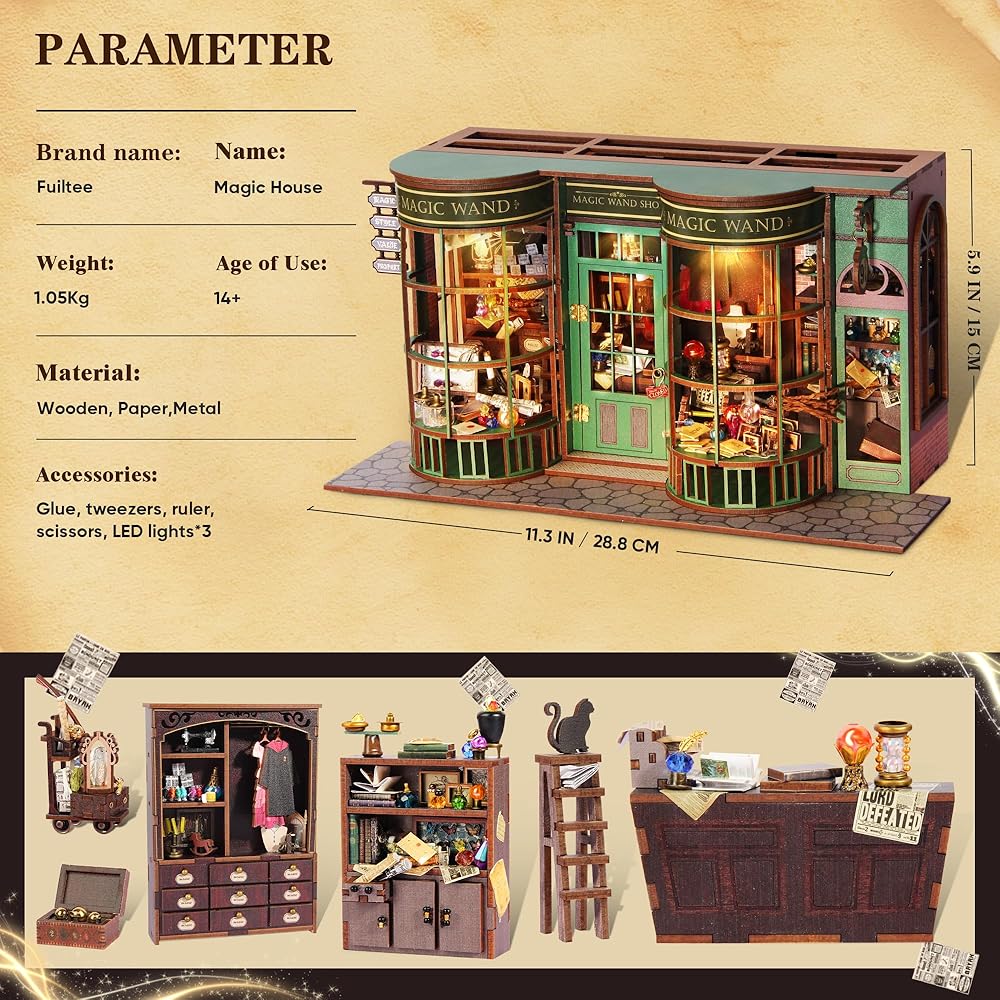 This diy miniature house combines multiple classic scenes and elements from the movie, such as a shop door that can be pushed open/closed, an old wooden sign, shelves full of magic wands, a magic broom... Lifelike details make you feel like a magician and feel the real magic world.