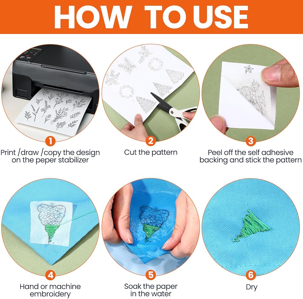 • Easy to Use: our sticky water soluble paper stabilizers are easy to use, you just need to pick your target printing hand embroidery, needling, cross-stitch, quilting, or other patterns onto the fabric of you likes, print, copy or draw your design on it, tear off the release paper and paste the design into the embroidery place, wash it out to finish your project