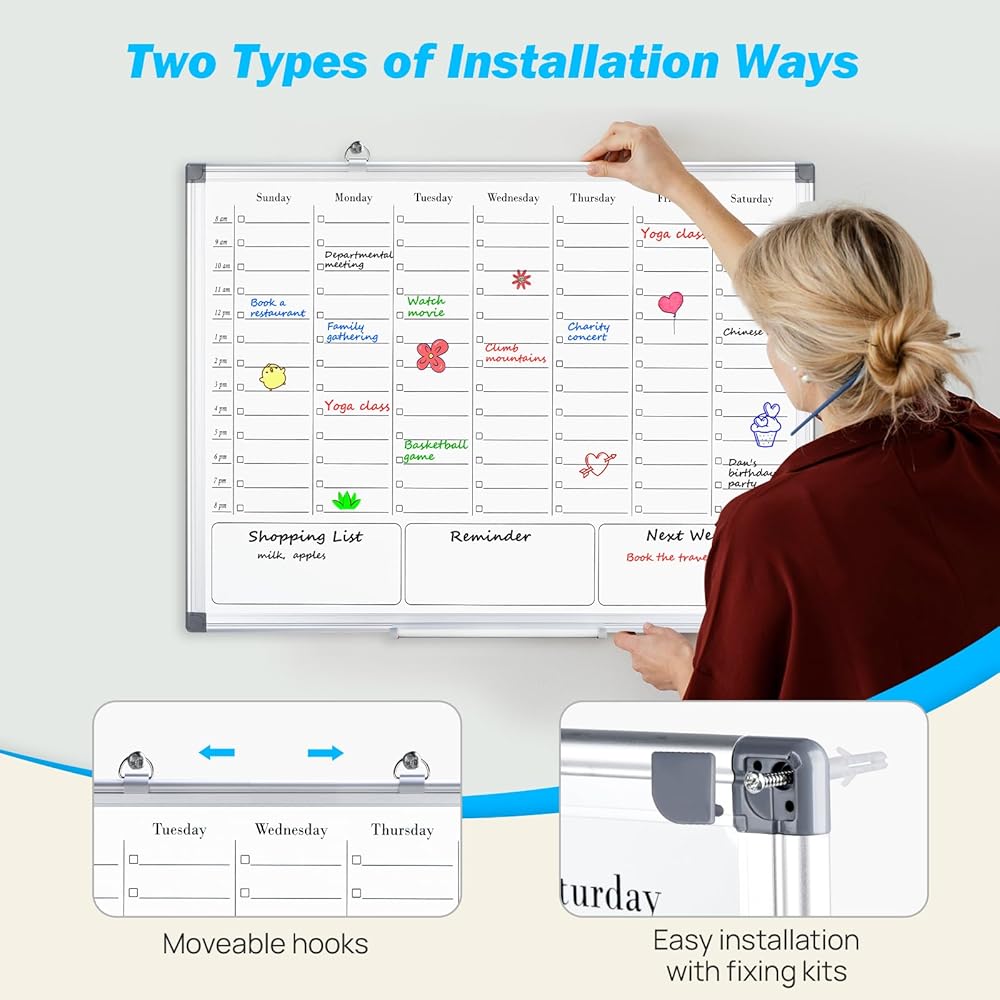 • 【تفاصيل الجودة العالية】 إطار السبورة هو إطار ألمنيوم فضي قوي ودائم. تم تجهيز لوحة المحو الجافة الأسبوعية للجدار بحامل قلم متحرك قابل للفصل والحلقات المعلقة الضرورية والأظافر والإكسسوارات المخفية للتركيب. نصيحة: 1 、 هذا اللوحة البيضاء غير مجهزة بأي أقلام أو ممحاة! 2 、 يجب وضع الملحقات المخفية الأظافر بعيدًا عن متناول الأطفال