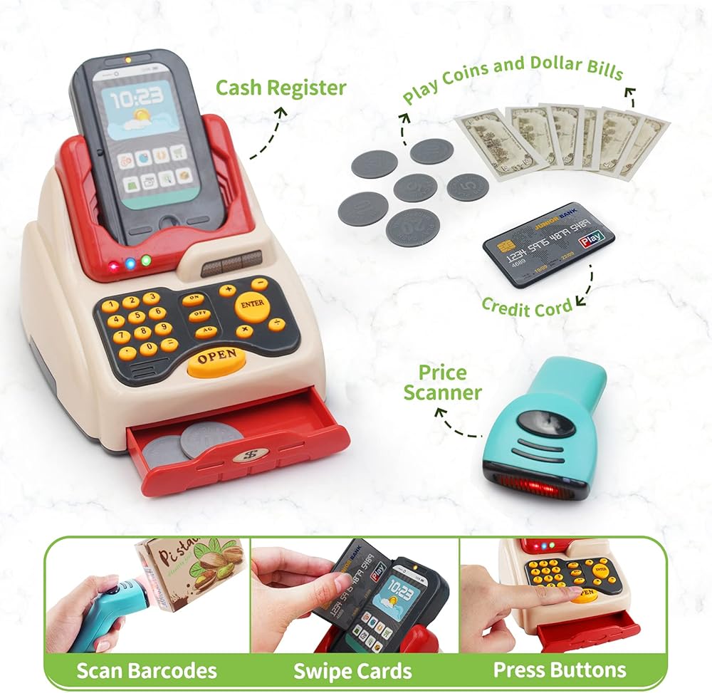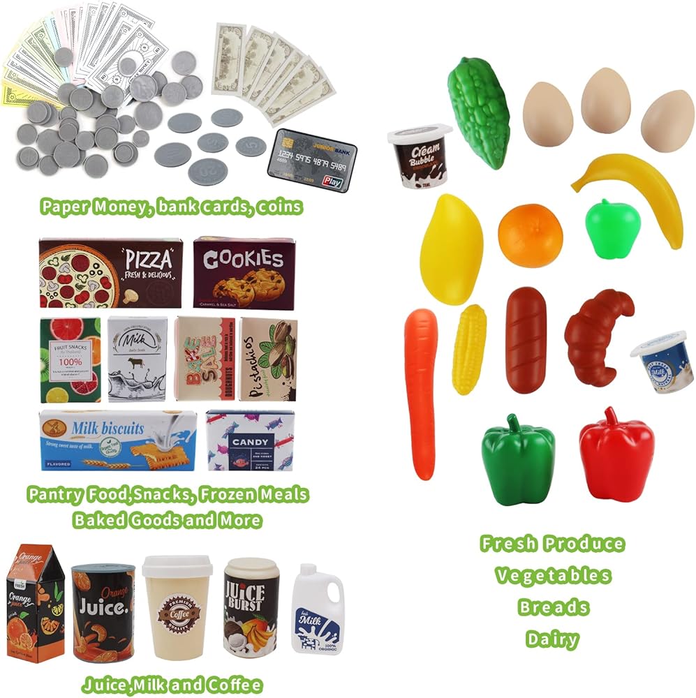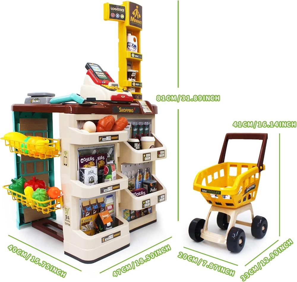 الميزات والوظائف: تتضمن مجموعة المسرحية هذه أكثر من 40 ملحقات التسوق التي سيحبها طفلك! يوجد حتى عربة تسوق وماسح ضوئي يعمل يوفر مسرحية أكثر تفاعلية لطفلك الصغير. كما تضمنت وظائف الضوء والصوت أيضًا إنشاء مسرحية أكثر واقعية لك