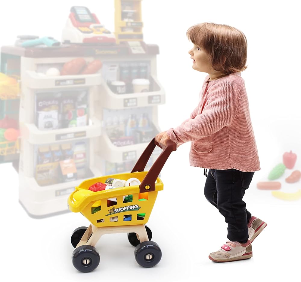 متعة التسوق: امنح القليل من تجربة التسوق الخاصة بك! مجموعة لعب العربة التسوق هذه هي الهدية المثالية لبعض الوقت الذي يحب المساعدة في المتجر الأسبوعي.