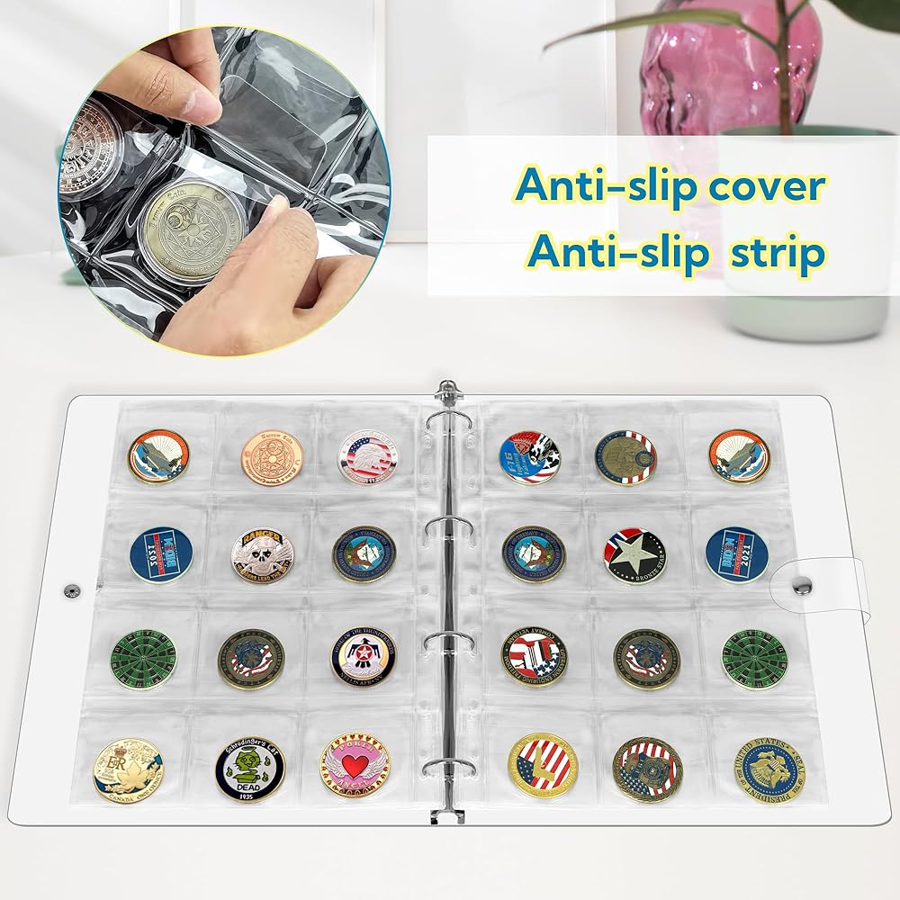 تصميم الجيب الشفاف: مصنوع من صفحة PVC ناعمة وشفافة صديقة للبيئة ، تم تجهيز كل جيب بغطاء وقائي غير انزلاق لمنع العملات المعدنية من الأكسدة والسقوط. مقاطع صفحة الحلقة المدمجة تجعل من السهل إضافة أو إزالة الصفحات. يحافظ على مجموعتك منظمة بدقة ومحمولة للسفر أو النقل.