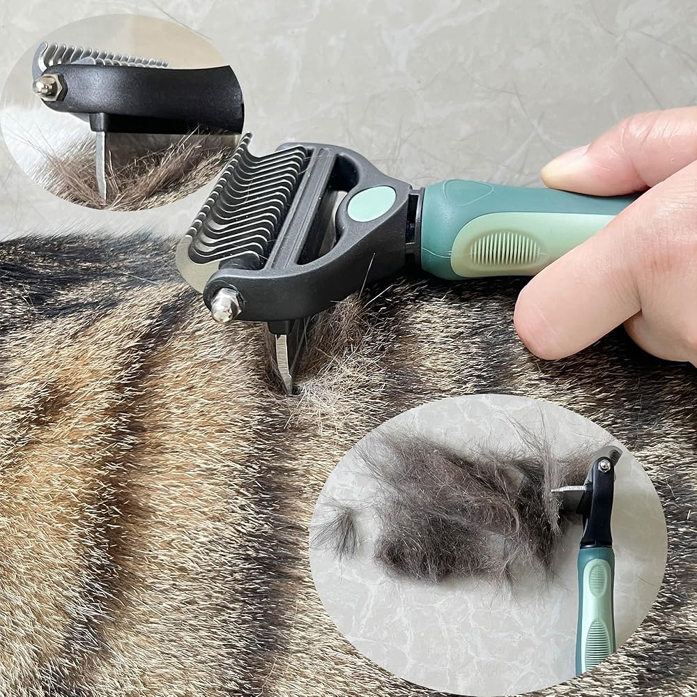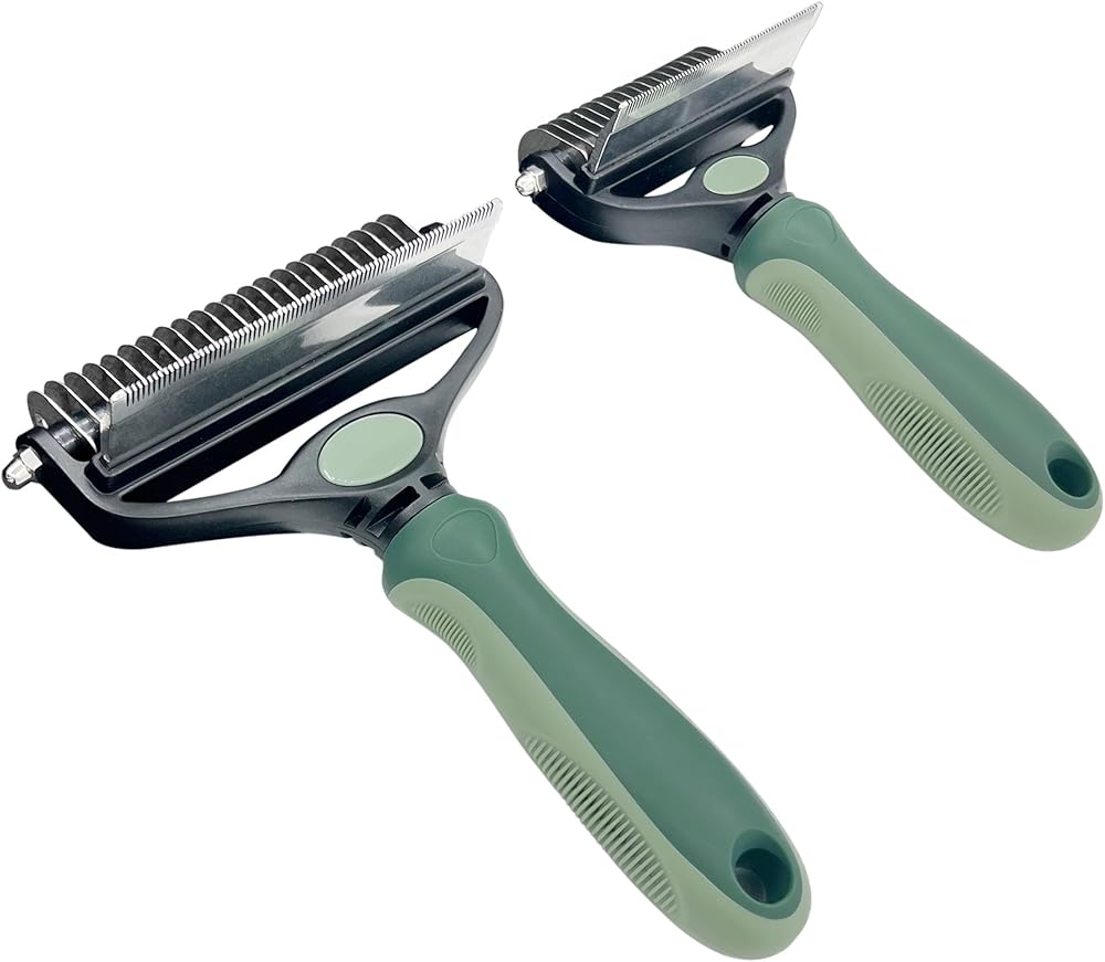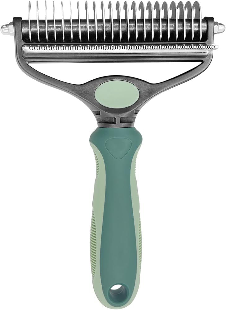 • Dual-Sided Design: One side features stainless steel teeth for detangling and dematting, while the other has a comb for brushing and smoothing the coat