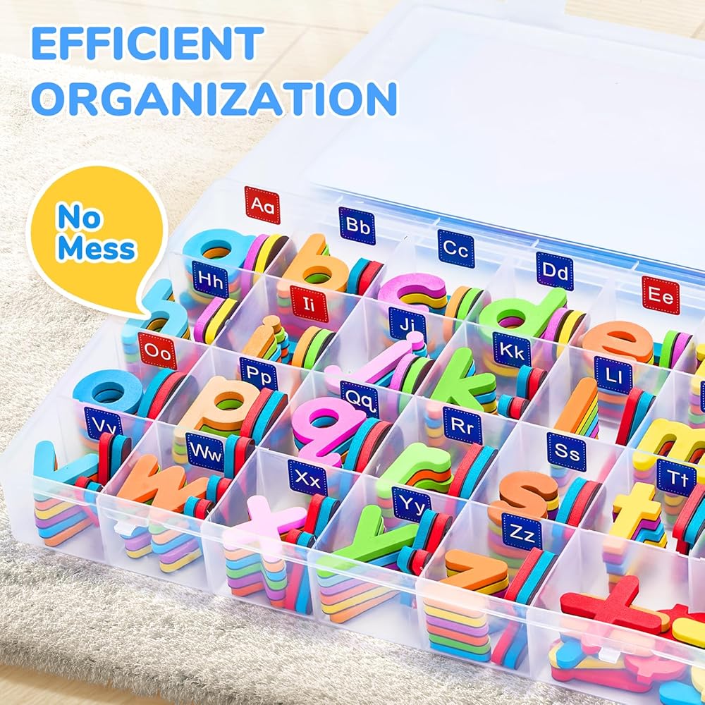 حالة تخزين فعالة للمؤسسة: احتفظ بجميع القطع الـ 248 منظمة بدقة في حالة التخزين البلاستيكية المضمنة. مع 27 مقصورة مسمولة بوضوح ، من السهل العثور على كل حرف ورقم مغناطيسي وتخزينه