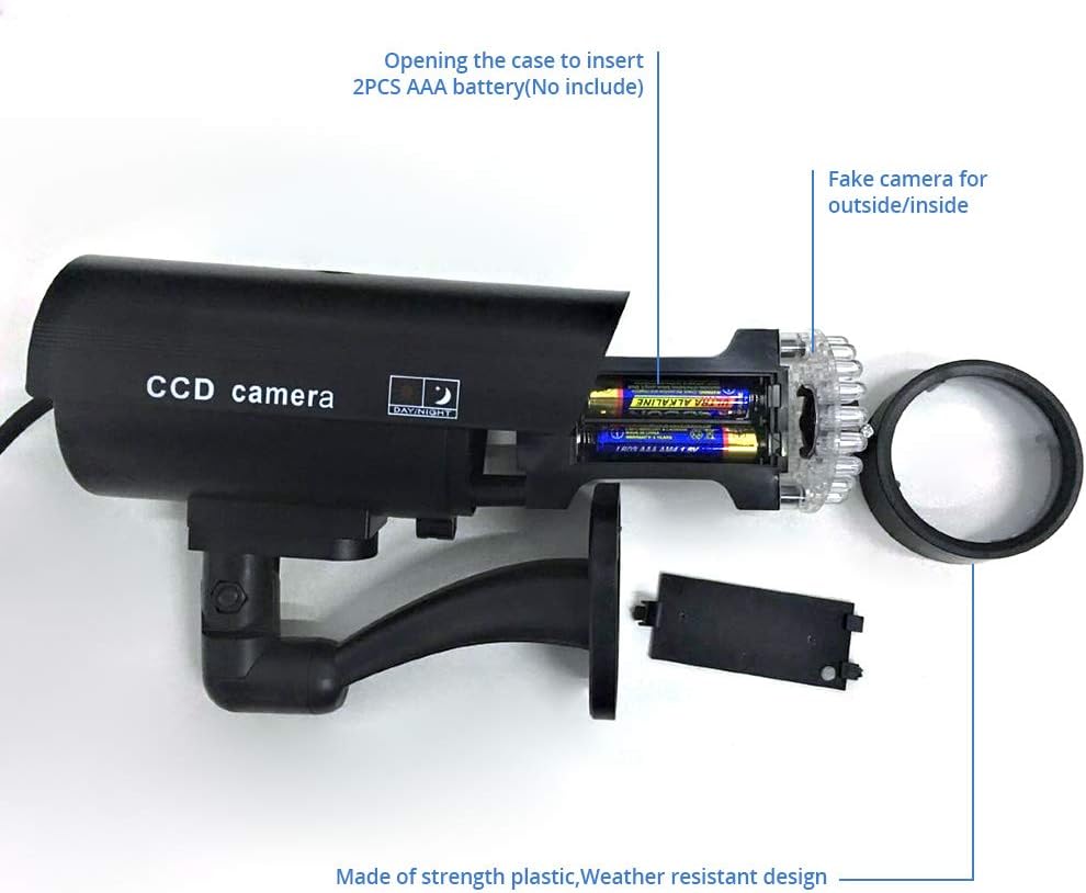 الميزة - الحل غير المكلف لمشاكل سرقة الأمان، بدون حركة عمومية آلية. يبدو أن الكاميرا المزيفة تعمل ككاميرا أمان حقيقية مع سلك مزيف ذو مظهر واقعي وتعمل مع بطاريتين AAA (غير متضمنة)
