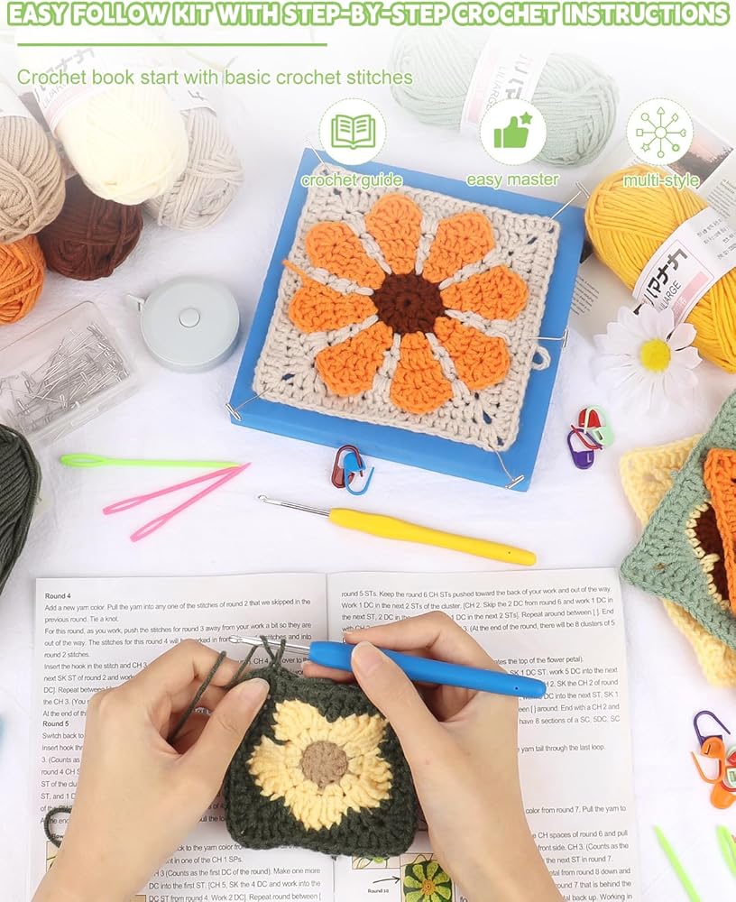 • Detailed Instruction Tutorial: Crochet kit for adults' instruction contains 7 tutorials, a fundamental stitch tutorial and 6 tutorials for multi-styles of granny squares. Crochet beginner kit starting with the basic stitches, from how to add and subtract stitches to the tying knots, you'll learn how to crochet 6 styles granny square (sun moon star & 3 style flower), from easy to hard. Attentions, flower granny square tutorial begins on page 18