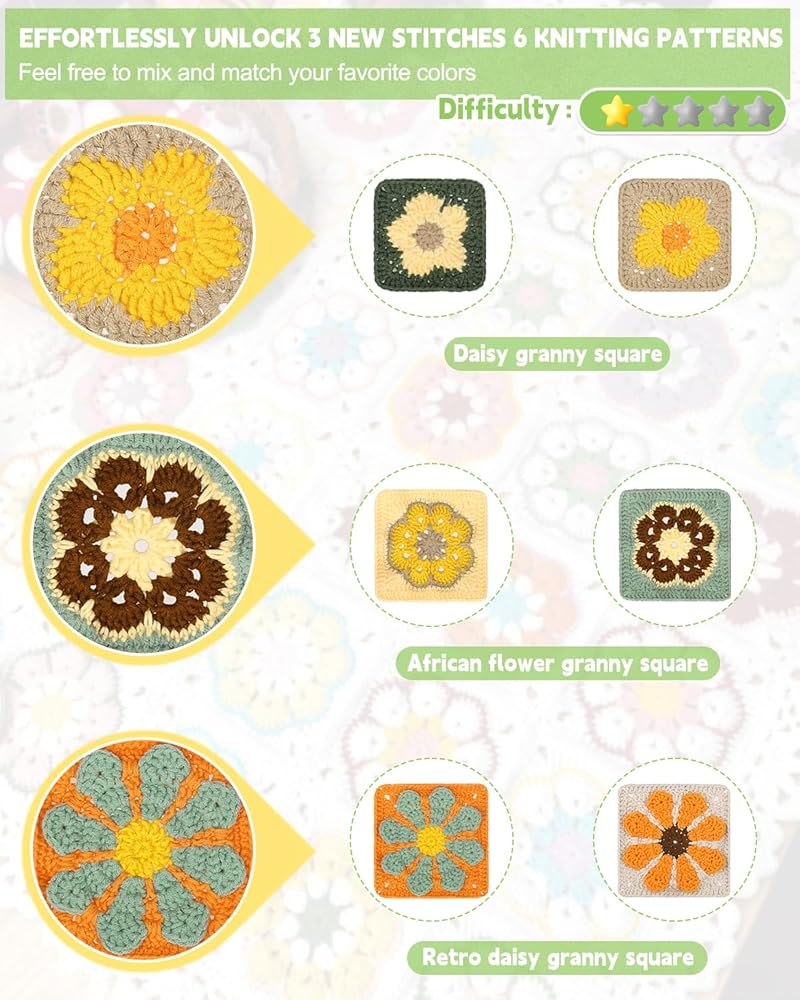The flower granny square crochet kit a little difficult than the average project, it's more suitable for enthusiasts who like to try different kinds of granny square or beginners who have practiced Katech basic granny squares.