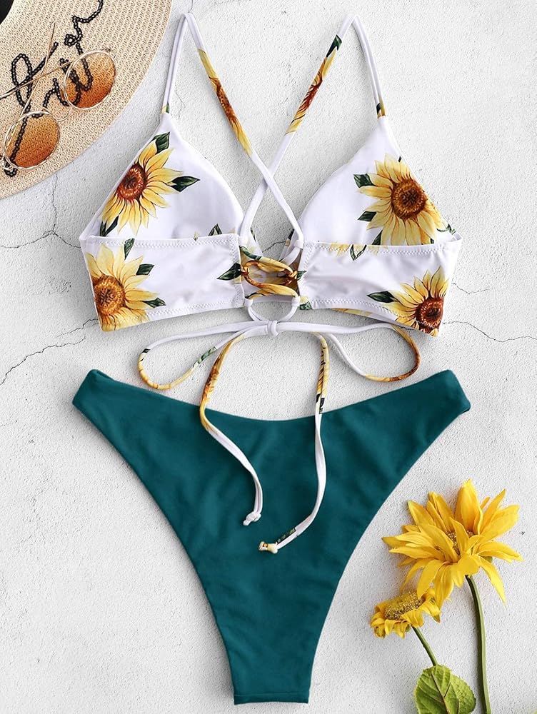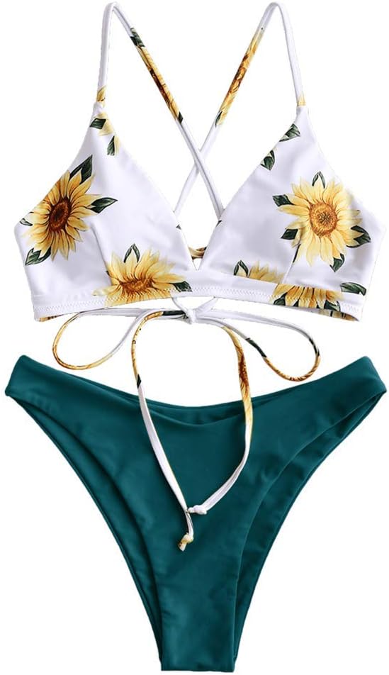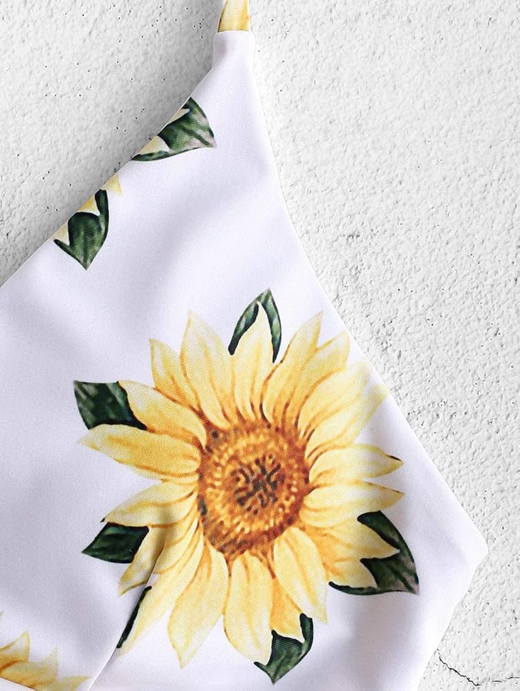 - بيكيني مكون من قطعتين بأربطة متقاطعة بأرجل عالية مع نمط طباعة عباد الشمس المعتدل. اجذبي انتباه الناس بهذا البيكيني الرائع في عطلتك